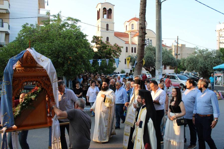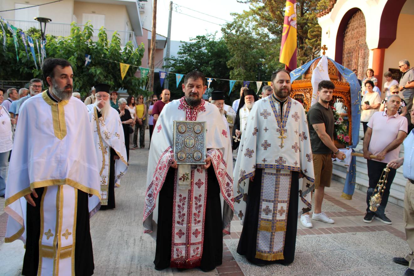 Στο τέλος της ακολουθίας του εσπερινού έγινε η λιτάνευση της εικόνας, που απεικονίζει το γεγονός της Πεντηκοστής, την οποία κρατούσαν ευλαβείς ενορίτες, ενώ προηγείτο η φιλαρμονική του Δήμου με τελετάρχη τον π. Αναστάσιο Ξανθίδη.
