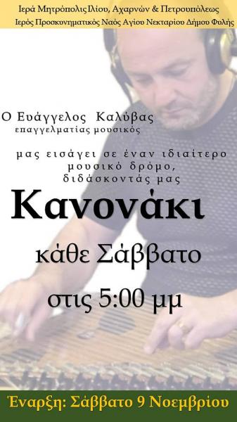 Ο Ιερός Προσκυνηματικός Ναός Αγίου Νεκταρίου Δήμου Φυλής διοργανώνει μαθήματα στο παραδοσιακό όργανο κανονάκι, κάθε Σάββατο στις 17:00, ξεκινώντας από το Σάββατο 9 Νοεμβρίου 2024.