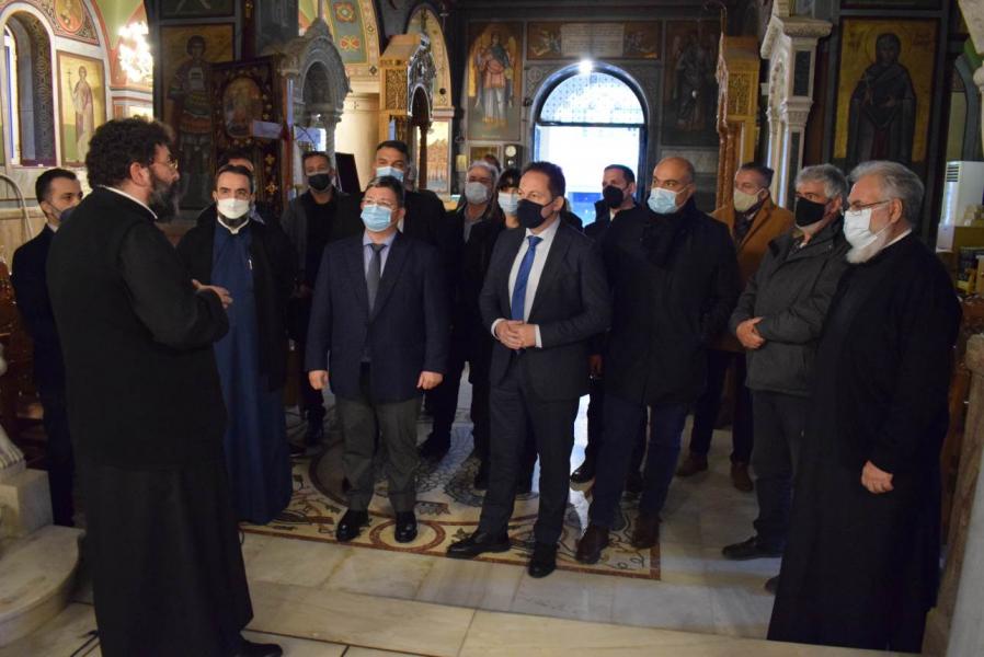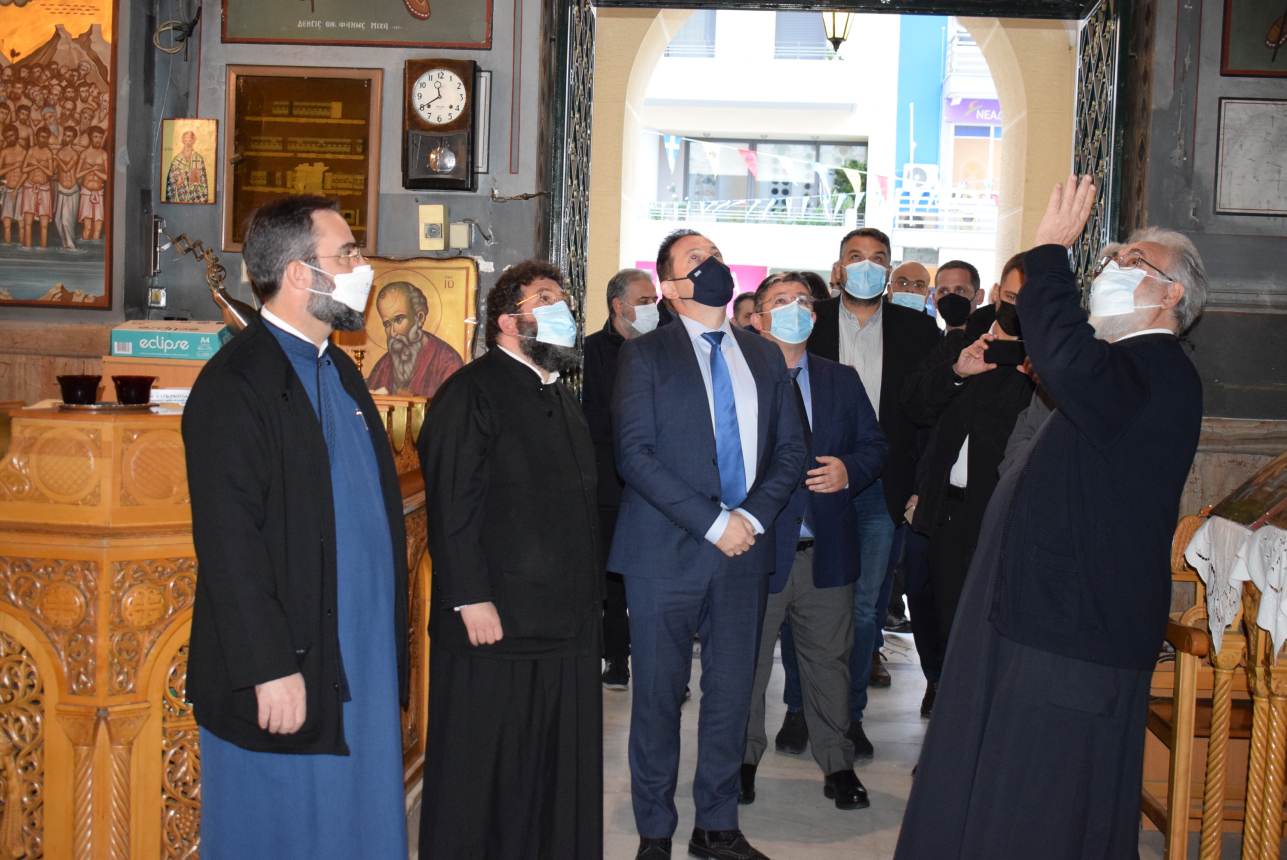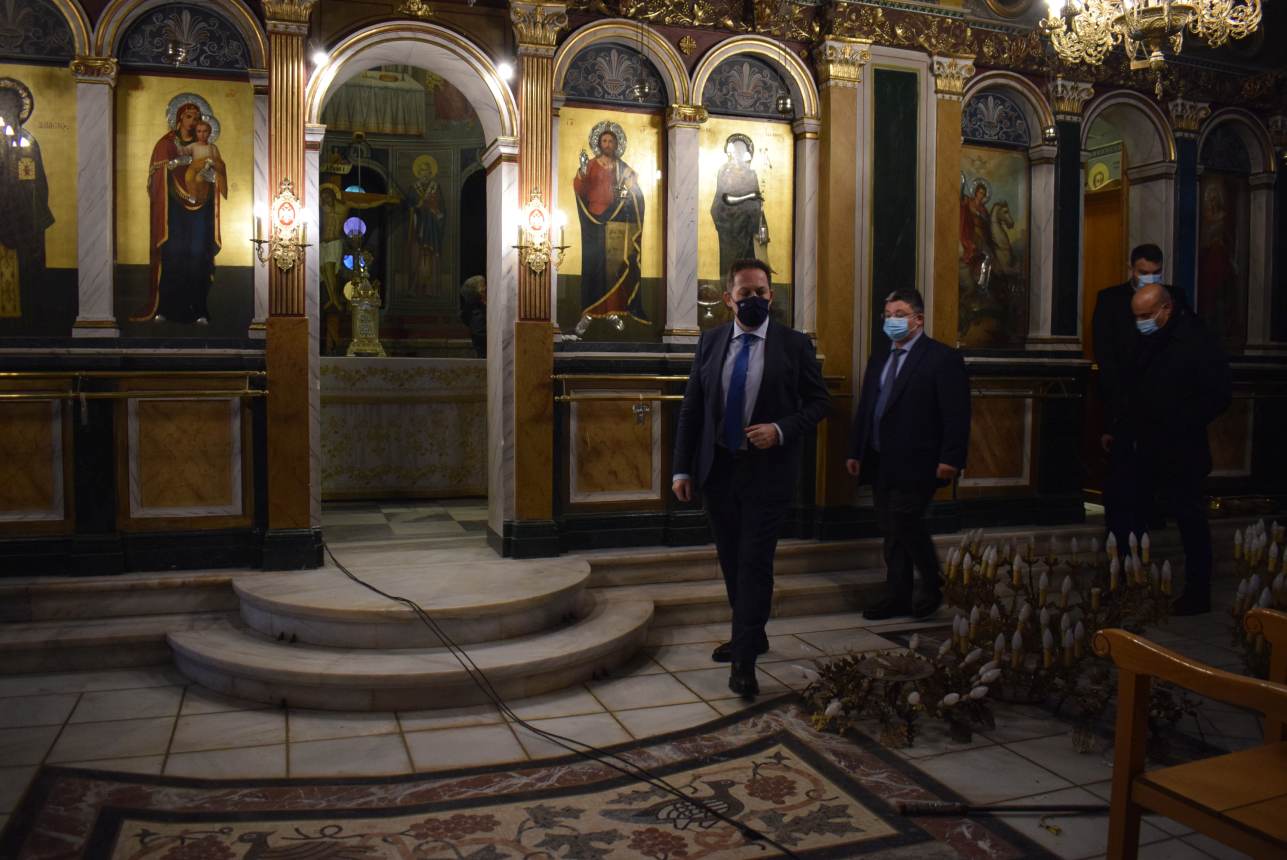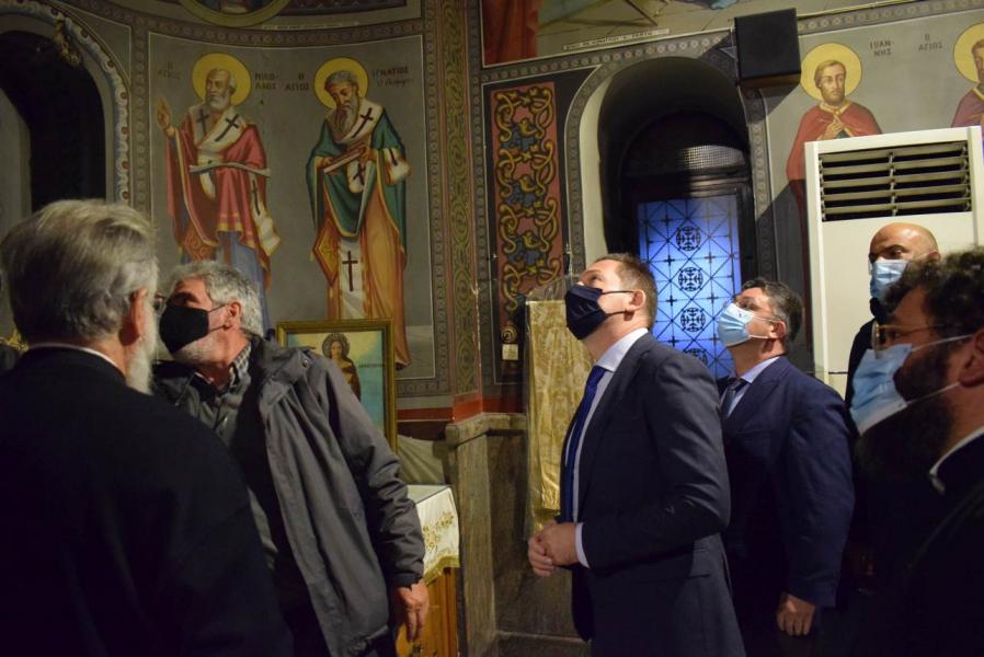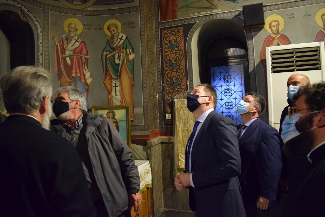 Ακολούθησε επίσκεψη τους, στον Ιερό Ναό του Αγίου Βλασίου, στην κεντρική πλατεία των Αχαρνών, προκειμένου ο κ. Υπουργός να διαπιστώσει την κατάσταση στην οποία βρίσκεται ο Ιερός Ναός, το  μέγεθος και την έκταση  των ζημίων.