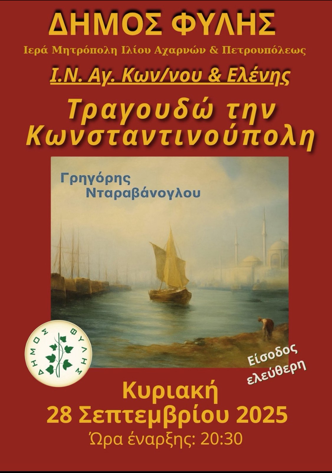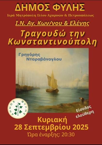 Μουσική εκδήλωση με τίτλο «Τραγουδώ την Κωνσταντινούπολη» με τον Πρωτοψάλτη Γρηγόριο Νταραβάνογλου θα πραγματοποιηθεί στον Ιερό Ναό Αγίων Κωνσταντίνου και Ελένης Άνω Λιοσίων την Κυριακή 28 Σεπτεμβρίου 2025, στις 20:30.
