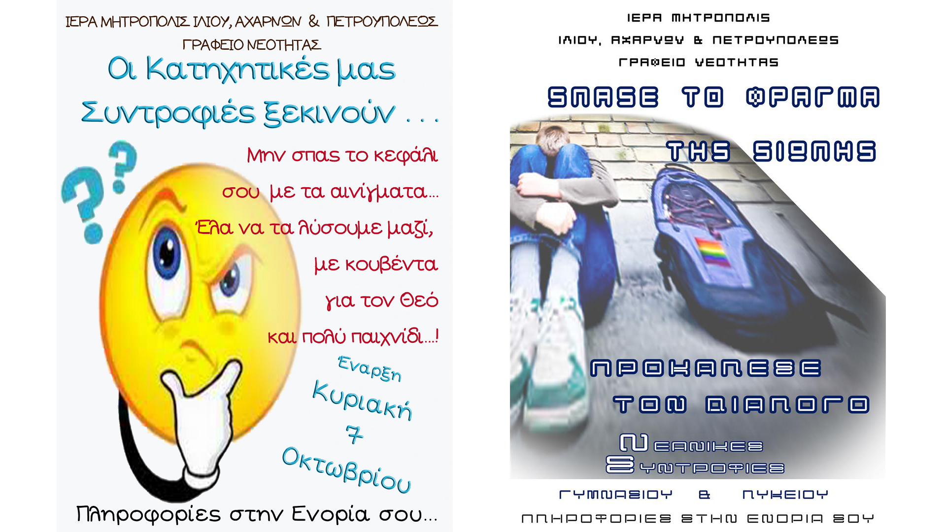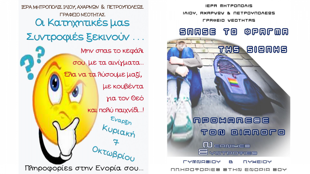 Ξεκινούν οι κατηχητικές συνάξεις για τα παιδιά ηλικίας Δημοτικού Σχολείου αλλά και οι νεανικές συντροφιές Γυμνασίου, Λυκείου και Φοιτητών.