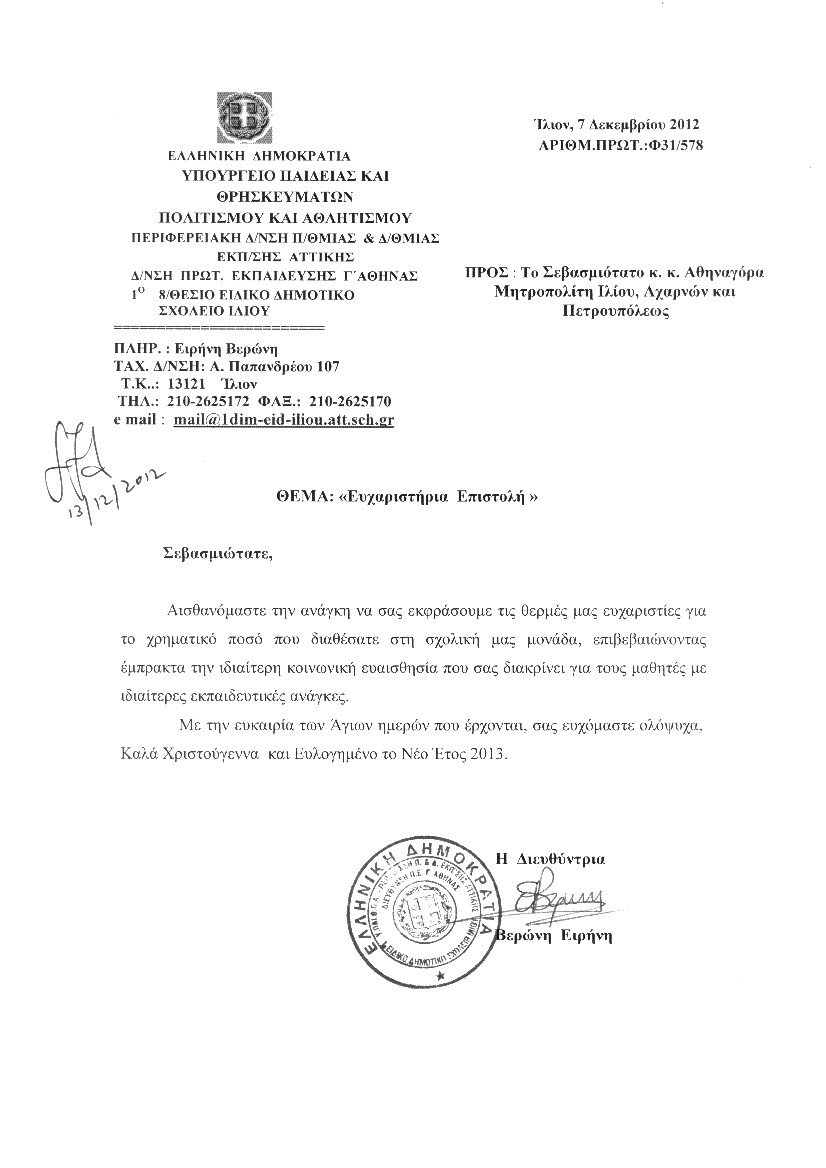 Ευχαριστήρια επιστολή από το 1ο Ειδικό Δημοτικό Σχολείο Ιλίου
