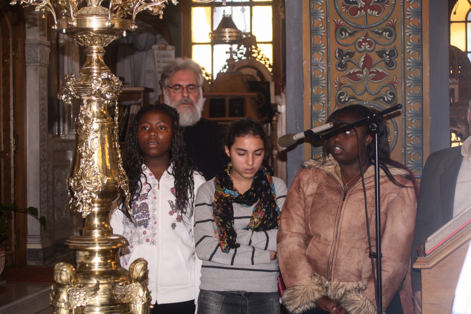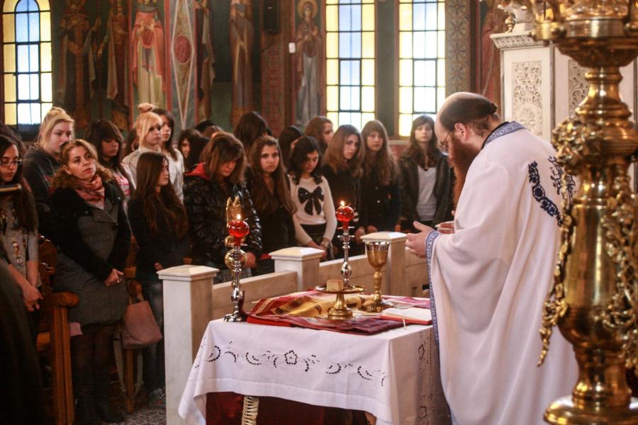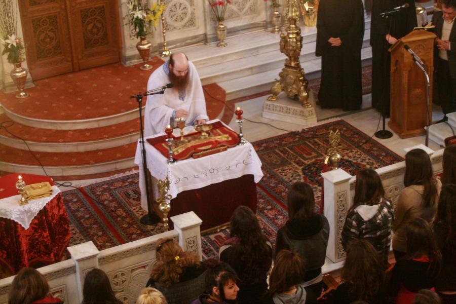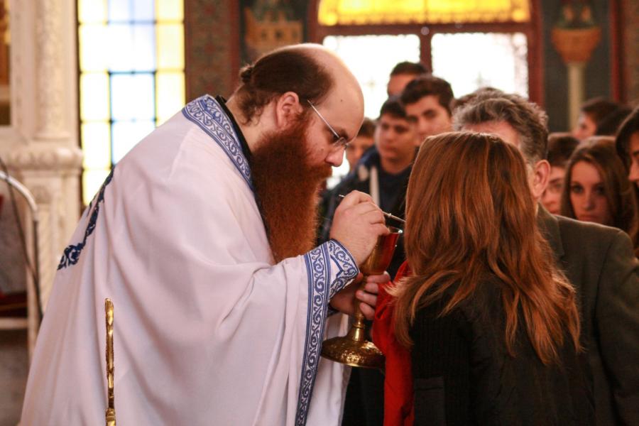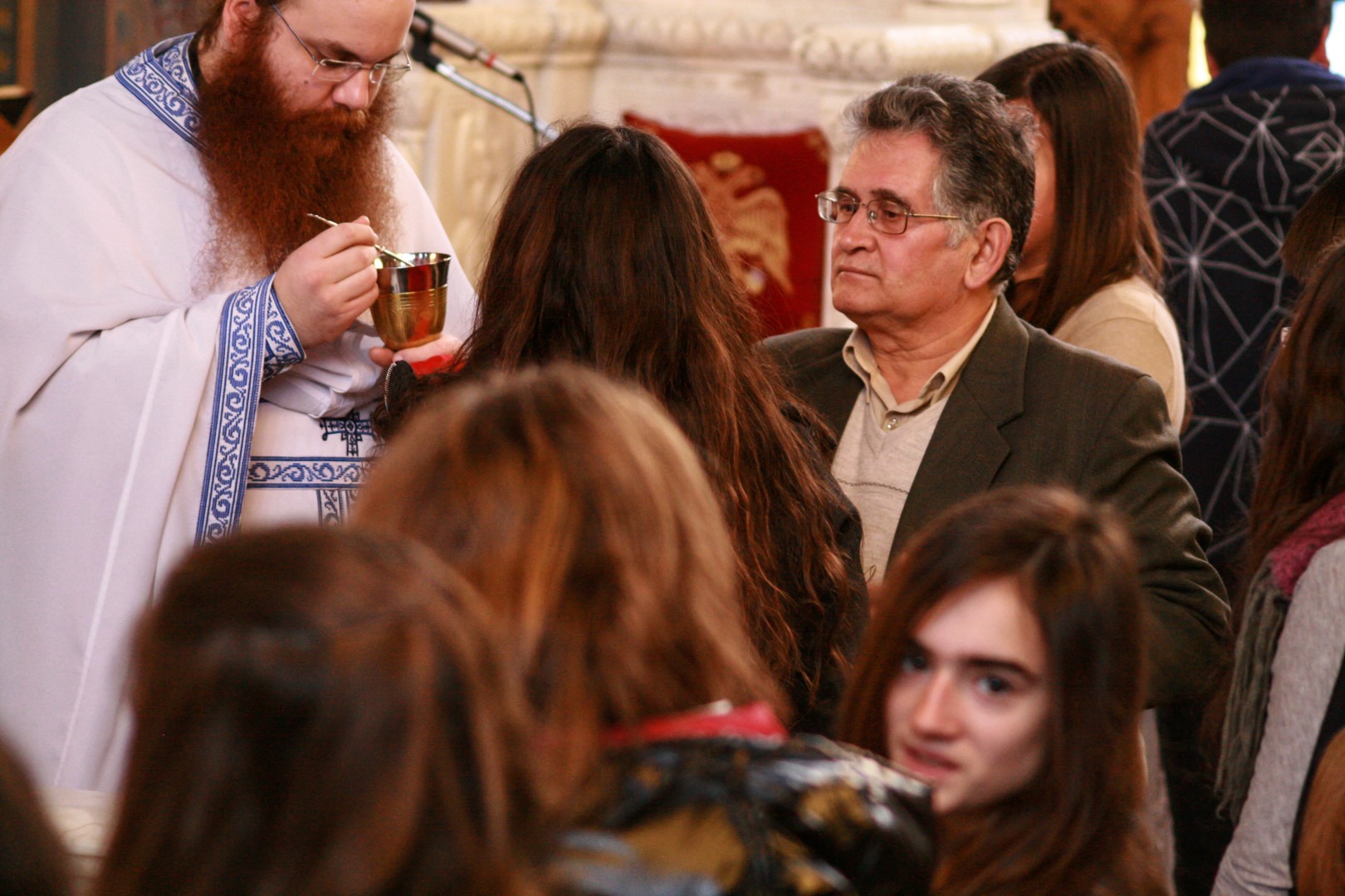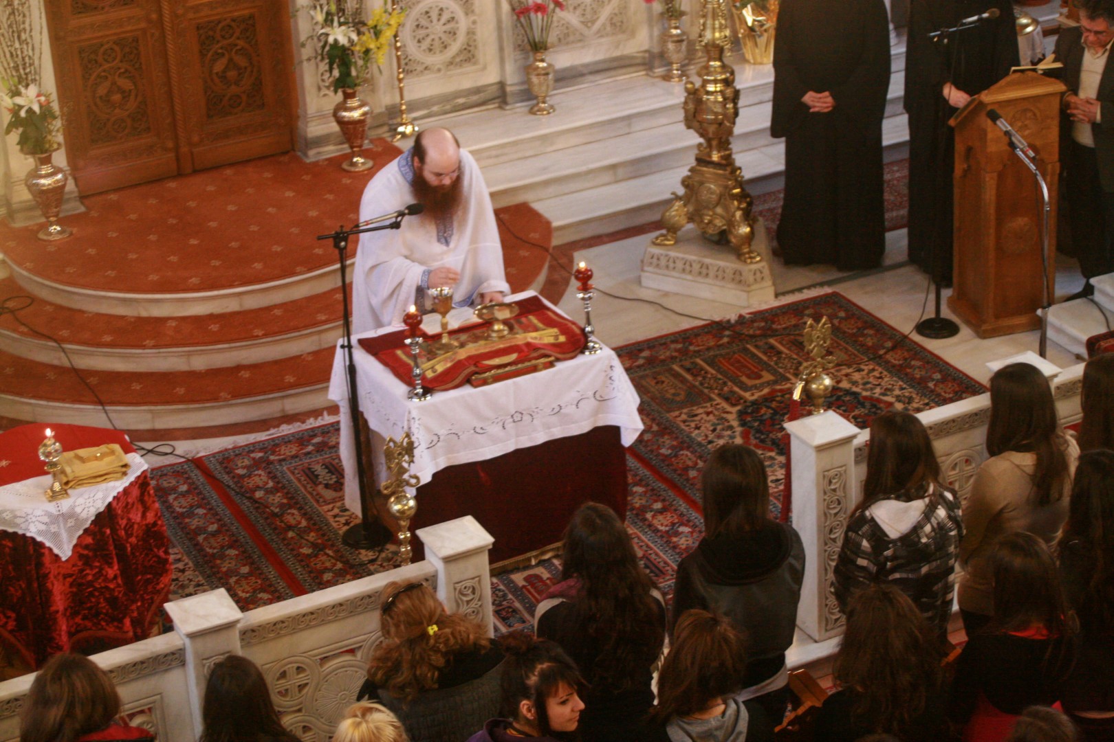 Αξιοσημείωτη είναι η στιγμή που τρεις μαθήτριες έψαλλαν, μετά τον καθαγιασμό των Τιμίων Δώρων, το «Άξιον εστίν».