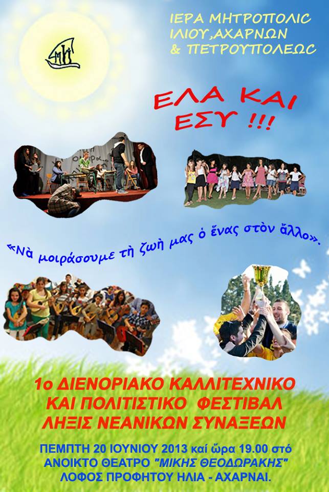Την Πέμπτη 20 Ιουνίου 2013 στις 19:00, στο ανοιχτό αμφιθέατρο «Μίκης Θεοδωράκης» του Δήμου Αχαρνών θα λάβει χώρα το 1ο διενοριακό καλλιτεχνικό και πολιτιστικό φεστιβάλ της Ι. Μ. Ιλίου.