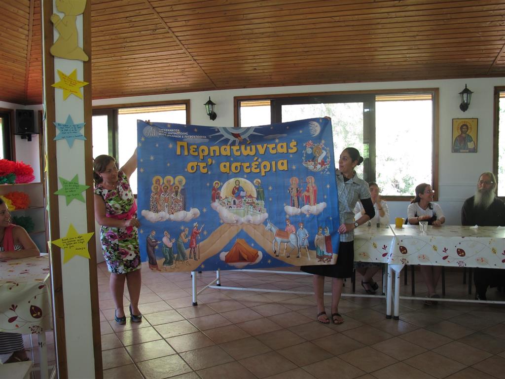 Στόχος του φετινού κατασκηνωτικού συνθήματος «Περπατώντας στ'αστέρια» ήταν να εμπνευστεί στα παιδιά η ανάγκη του φρονείν τα άνω, δηλαδή της αιωνιότητας στη ζωή τους, που καταξιώνεται με την μίμηση των Αγίων. Ειδικό αφιέρωμα πραγματοποιήθηκε στους Αγίους Κωνσταντίνο και Ελένη, με αφορμή την επέτειο συμπληρώσεως 1700 ετών από την υπογραφή του Διατάγματος των Μεδιολάνων, καθώς και στο ζήτημα της ύπαρξης  Κρυπτοχριστιανών στις ημέρες μας, με το οποίο ασχολήθηκε και το σοβαρό θεατρικό της εορτής των γονέων.