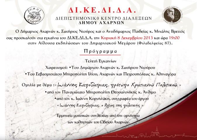 Τα εγκαίνια του Διεπιστημονικού Κέντρου Διαλέξεων Αχαρνών θα τελεστούν σύμφωνα με το ανωτέρω πρόγραμμα.
