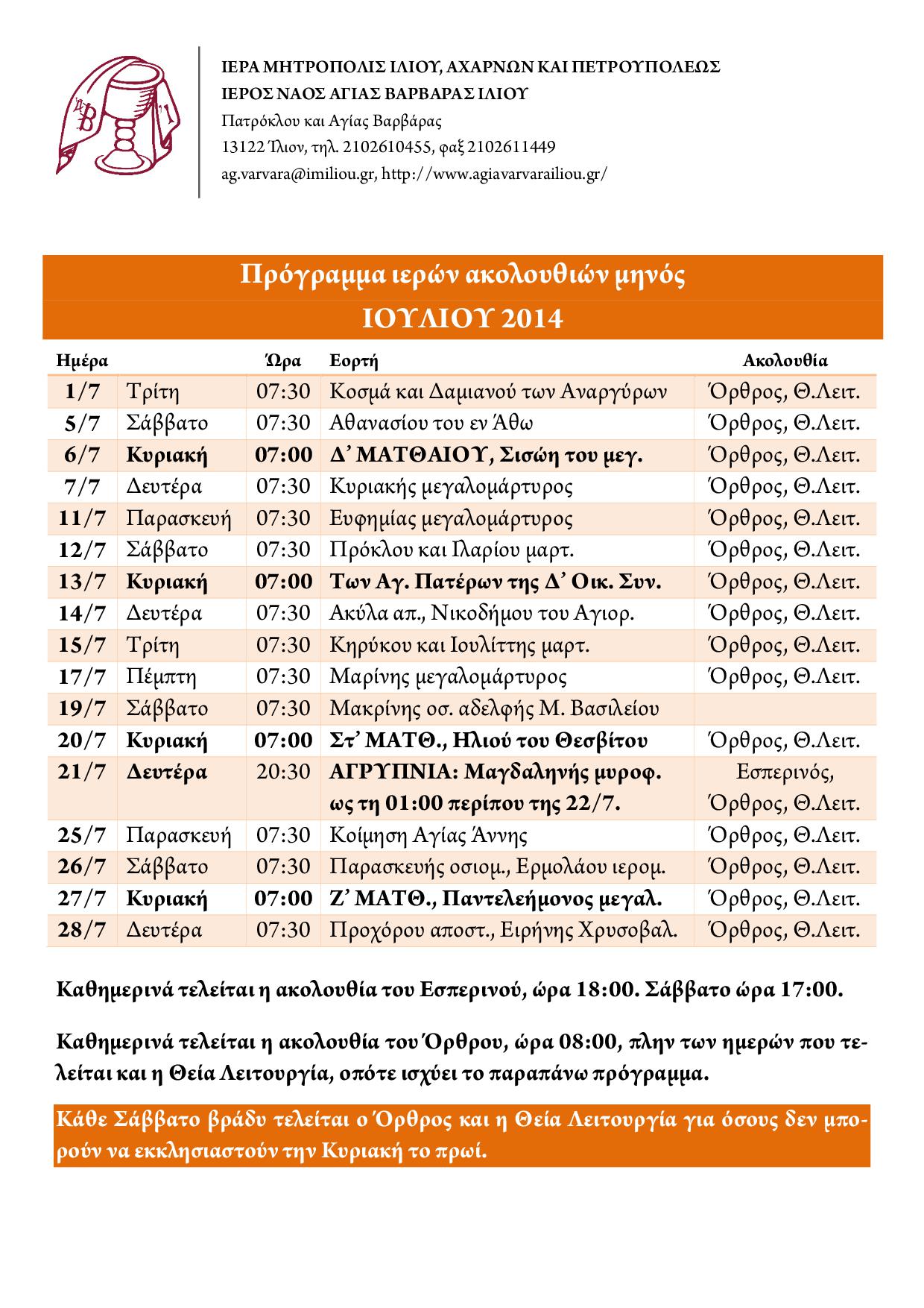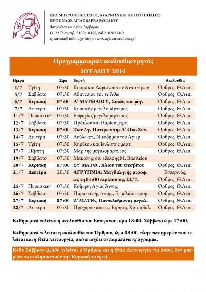 Δείτε το πρόγραμμα των ακολουθιών του Ι.Ν. Αγ. Βαρβάρας Ιλίου για τον μήνα Ιούλιο 2014.