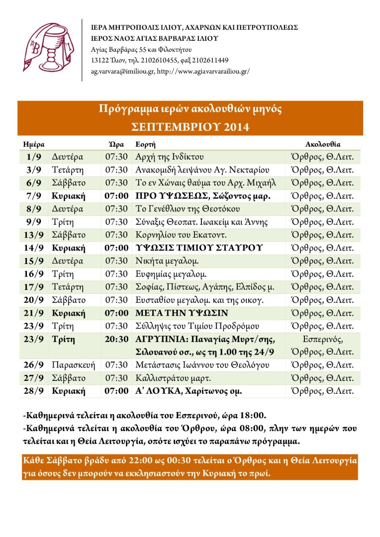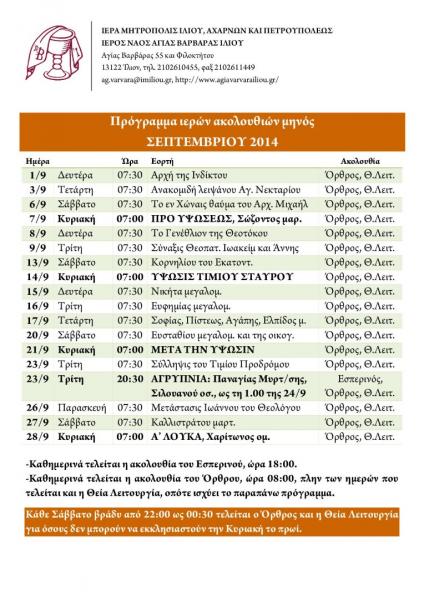 Δείτε το πρόγραμμα των ακολουθιών του Ι.Ν. Αγ. Βαρβάρας Ιλίου για τον μήνα Σεπτεμβρίου 2014.