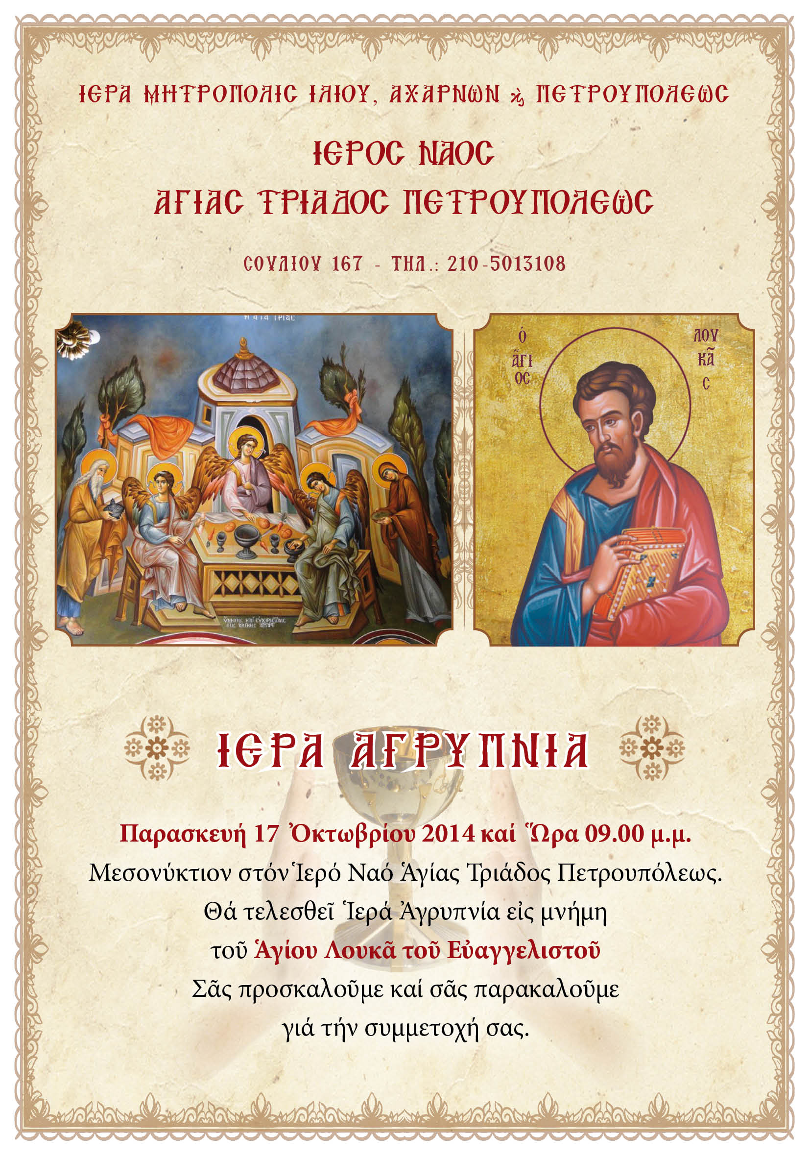 Αγρυπνία στον Ιερό Ναό Αγ. Τριάδας Πετρουπόλεως, την Παρασκευή 17 Οκτωβρίου, στη μνήμη του Ευαγγελιστού Λουκά, σύμφωνα με το παραπάνω πρόγραμμα.