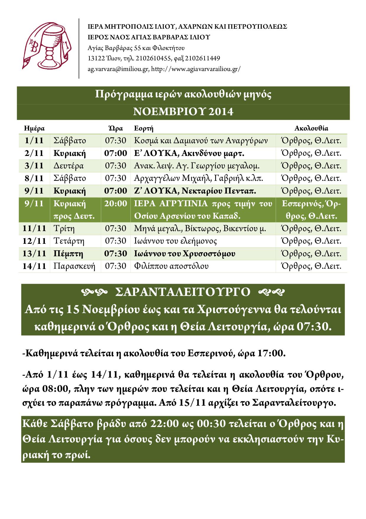 Δείτε το πρόγραμμα των ακολουθιών του Ι.Ν. Αγ. Βαρβάρας Ιλίου για τον μήνα Νοέμβριο 2014.