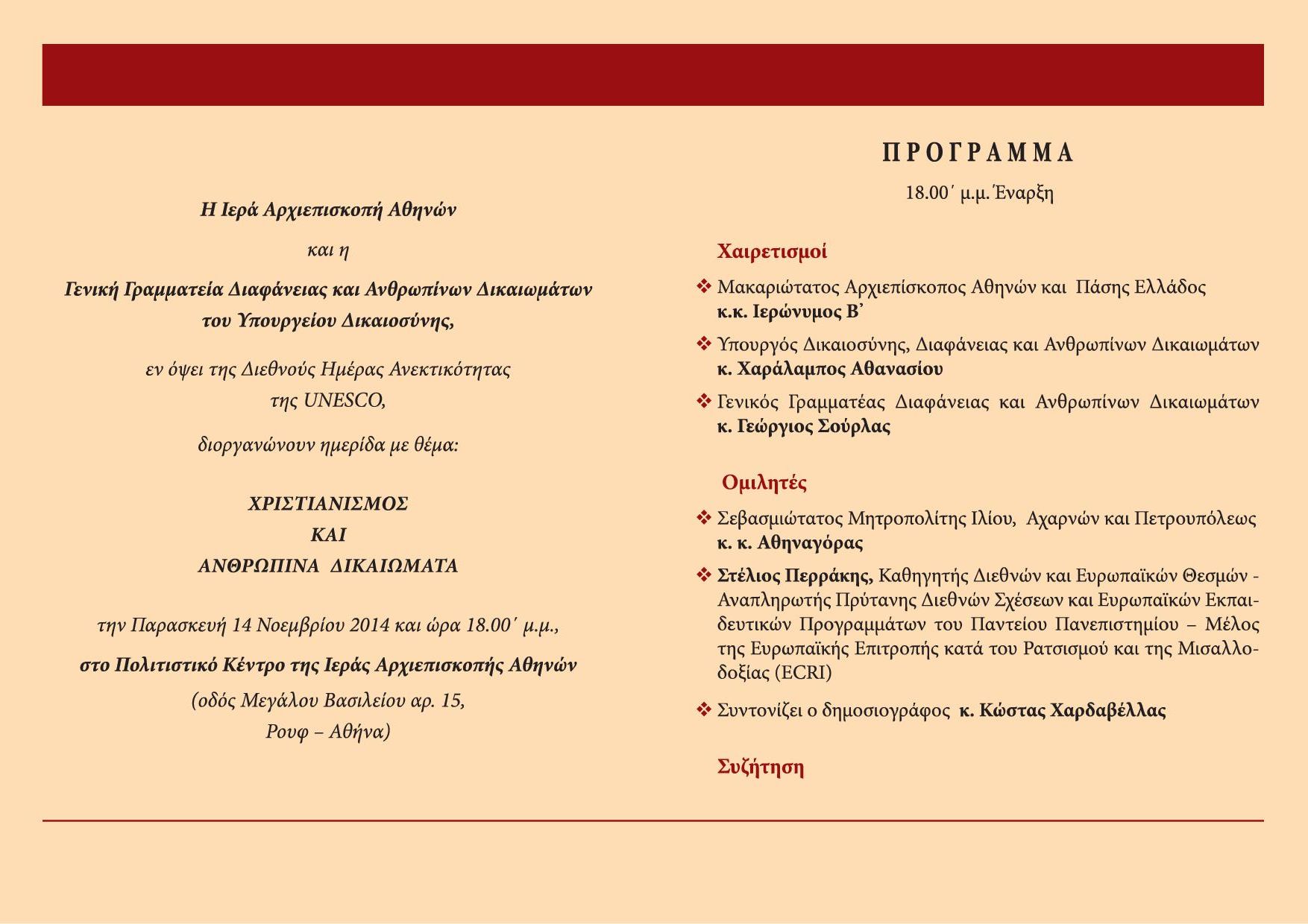 Η ημερίδα διοργανώνεται εν όψει της Διεθνούς Ημέρας Ανεκτικότητας της UNESCO, την Παρασκευή 14 Νοεμβρίου 2014 και ώρα 18.00, στο Πολιτιστικό Κέντρο της Ιεράς Αρχιεπισκοπής Αθηνών (Μεγάλου Βασιλείου 15, Ρουφ – Αθήνα).