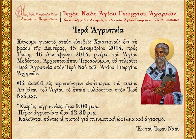 Κάνουμε γνωστό στούς εὐσεβεῖς Χριστιανούς ὅτι τὸ βράδυ τῆς Δευτέρας 15 Δεκεμβρίου 2014, πρός Τρίτη, 16 Δεκεμβρίου 2014, μνήμη τοῦ Ἁγίου Μοδέστου, Ἀρχιεπισκόπου Ἱεροσολύμων, θά τελεσθεῖ Ἱερά Ἀγρυπνία στόν Ἱερὸ Ναὸ τοῦ  Ἄγίου Γεωργίου Ἀχαρνῶν.