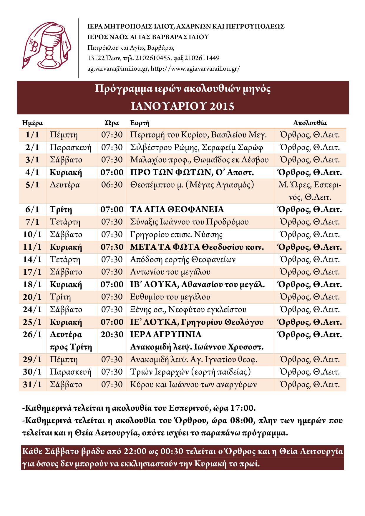 Δείτε το πρόγραμμα των ακολουθιών του Ι.Ν. Αγ. Βαρβάρας Ιλίου για τον μήνα Ιανουάριο 2015.
