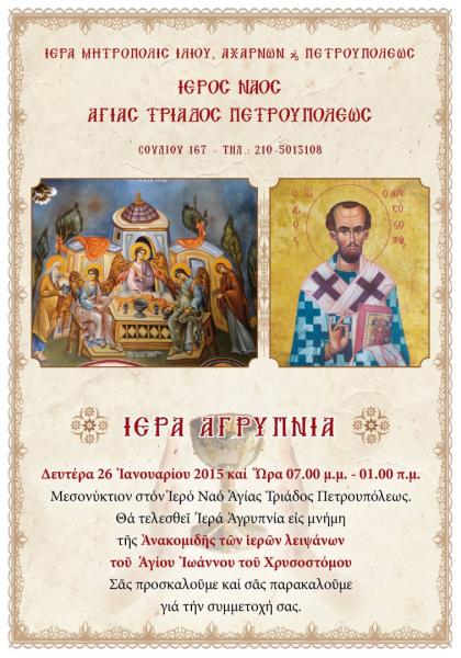 Για την εορτή της ανακομιδής των ιερών λειψάνων του Αγ. Ιωάννου του Χρυσοστόμου θα τελεστεί αγρυπνία στον Ι.Ν. Αγ. Τριάδος Πετρουπόλεως.