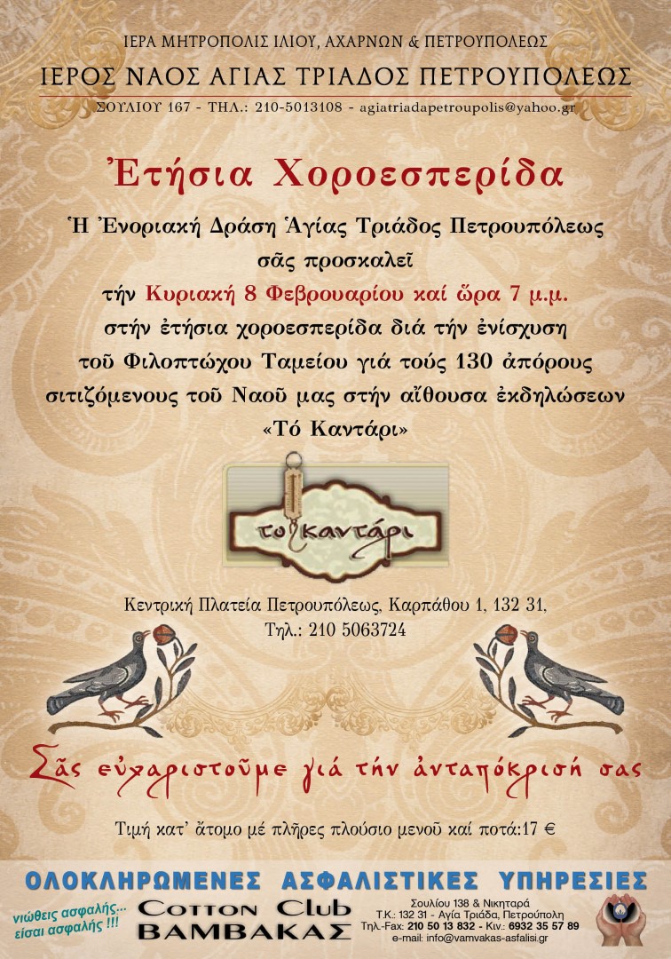 Ενημέρωση για την ετήσια χοροεσπερίδα, για την ενίσχυση του Ταμείου Ενοριακής Δράσης της ενορίας.
