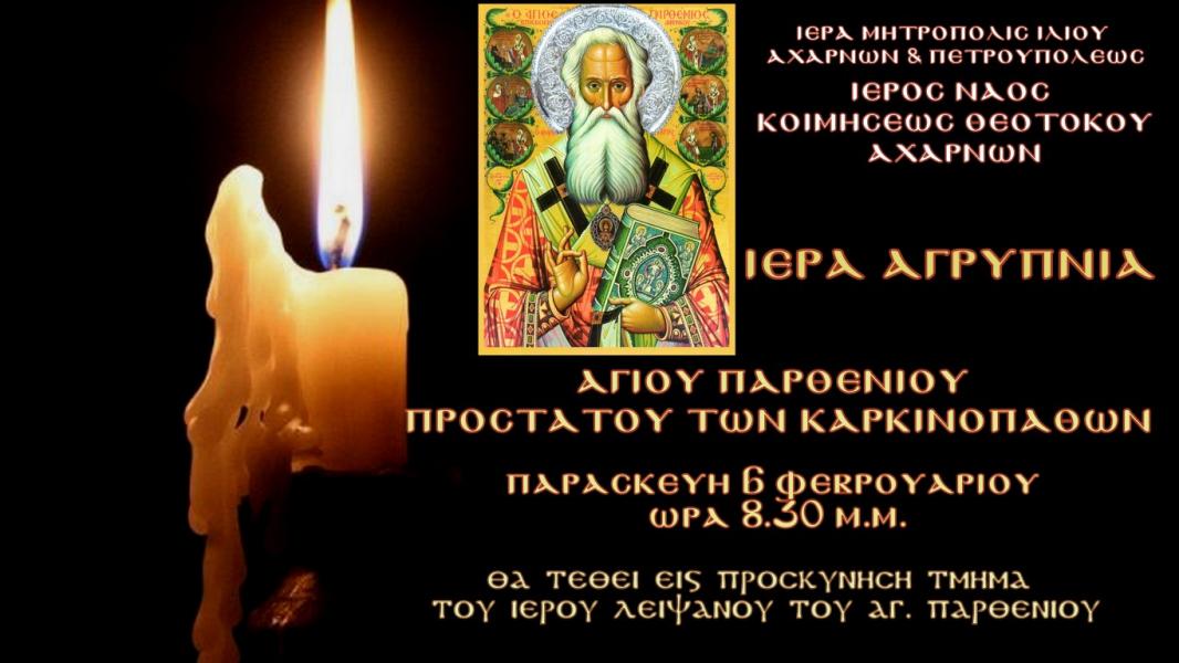 Την Παρασκευή 6 Φεβρουαρίου 2015 και ώρα 8.30 μ.μ., στον Ιερό Ναό Κοιμήσεως Θεοτόκου Αχαρνών θα τελεσθεί Ιερά Αγρυπνία επί τη μνήμη του εν Αγίοις Πατρός ημών Παρθενίου Επισκόπου Λαμψάκου του θαυματουργού, προστάτου των καρκινοπαθών.
