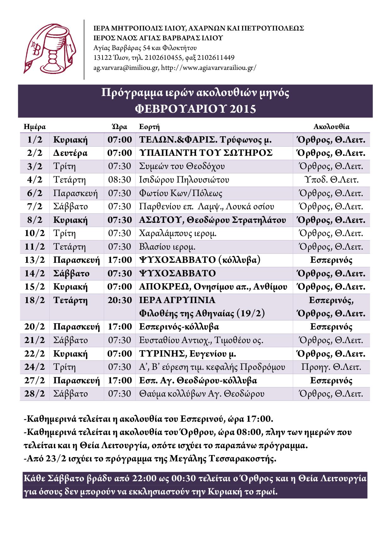 Δείτε το πρόγραμμα των ακολουθιών του Ι.Ν. Αγ. Βαρβάρας Ιλίου για τον μήνα Φεβρουάριο 2015.