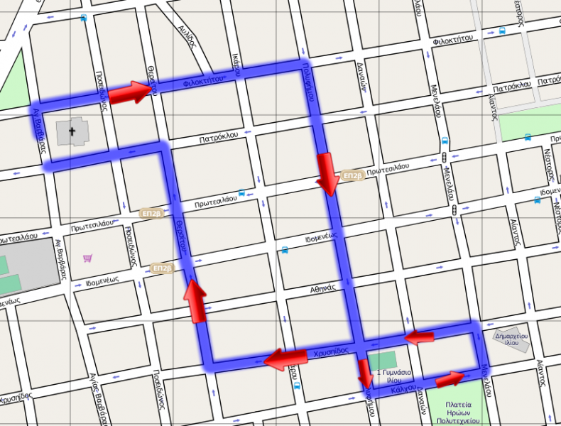 Ο Επιτάφιος θα διέλθει δια των οδών: Φιλοκτήτου - Πολυφήμου - Κάλχου - (Δημαρχείο) - Μενελάου - Χρυσηίδος - Θερσίτου - Πατρόκλου.