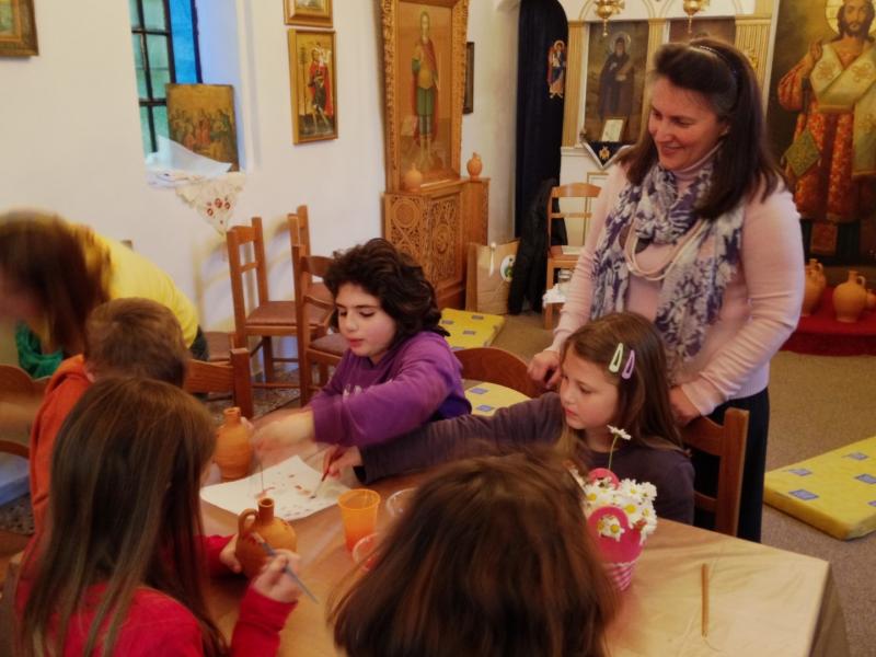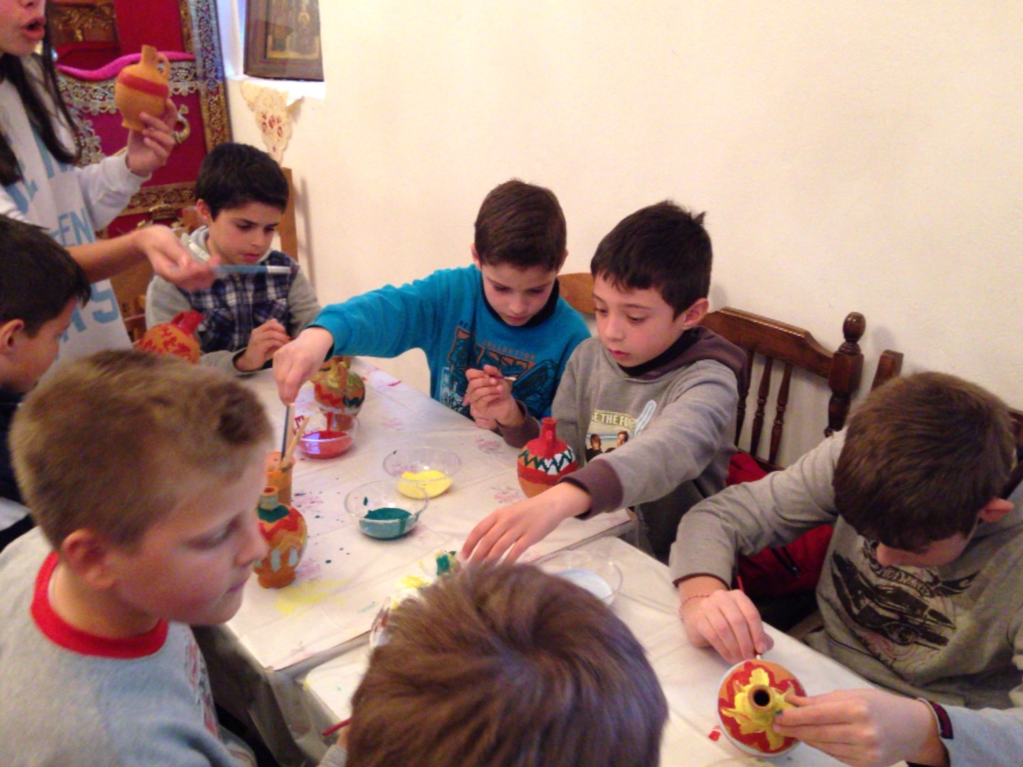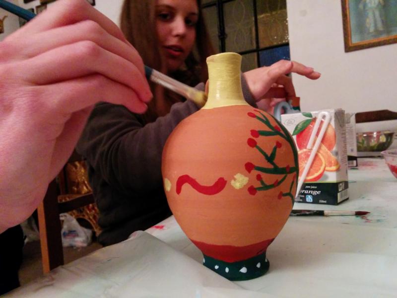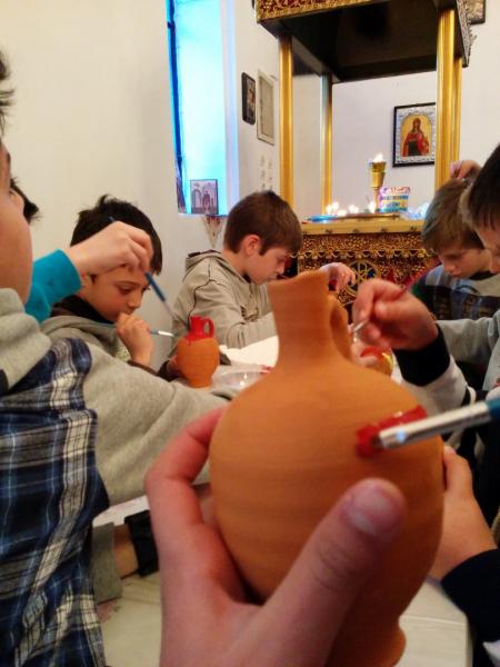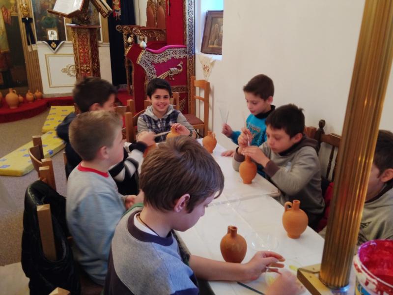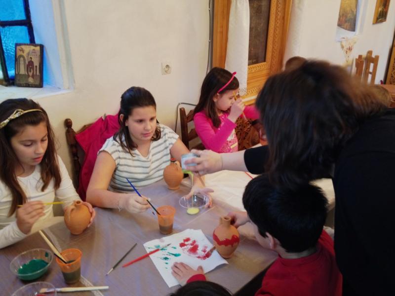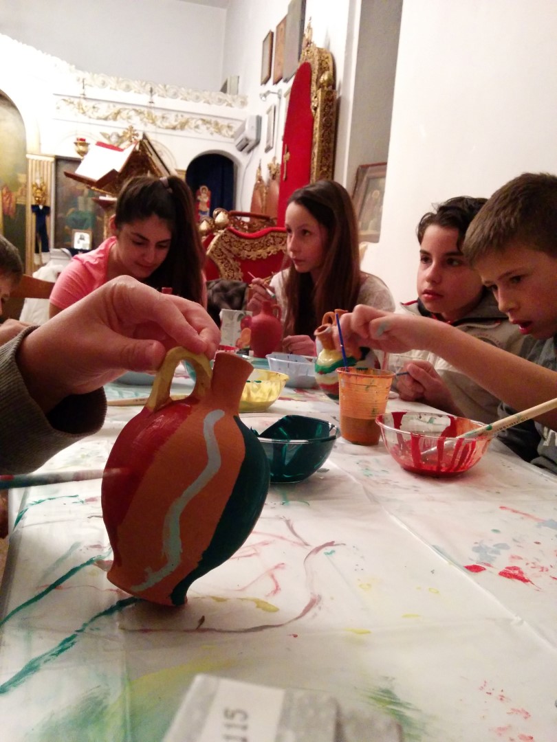 Στη συνέχεια είχαμε ετοιμάσει ένα καλλιτεχνικό εργαστήρι για τα μικρότερα παιδιά (5-11 ετών) όπου ξεδίπλωσαν το ταλέντο τους ζωγραφίζοντας πήλινα κανατάκια ενώ τα μεγαλύτερα (12-15 ετών) έκαναν αναπαράσταση του πασχαλινού εθίμου των «μπότηδων» σπάζοντας πήλινα κανάτια γεμάτα με νερό στο προαύλιο του ιερού ναού του Αγίου Αντωνίου!