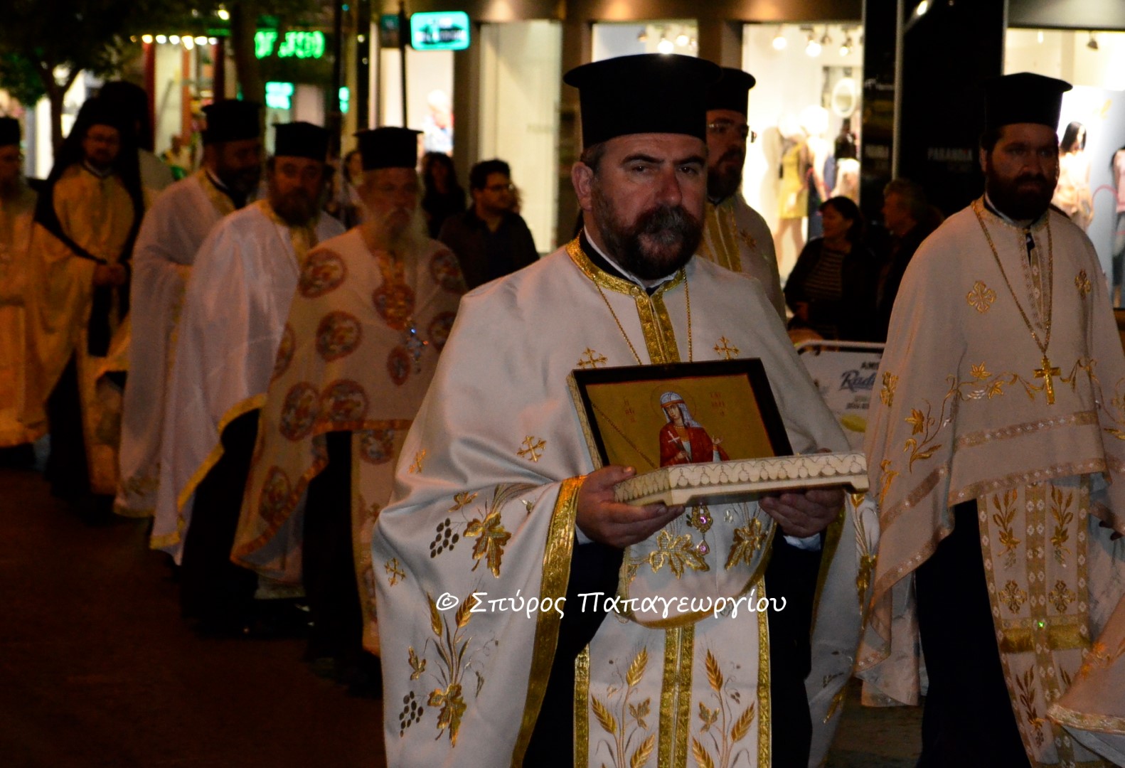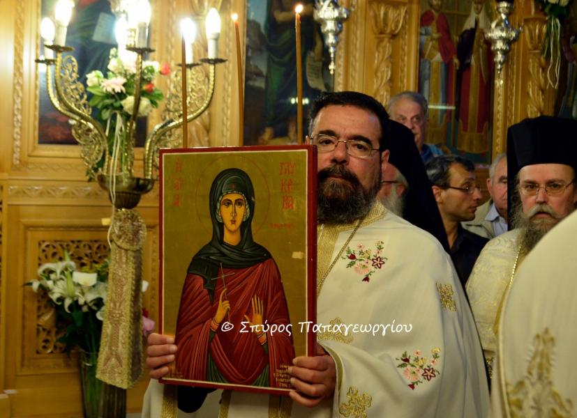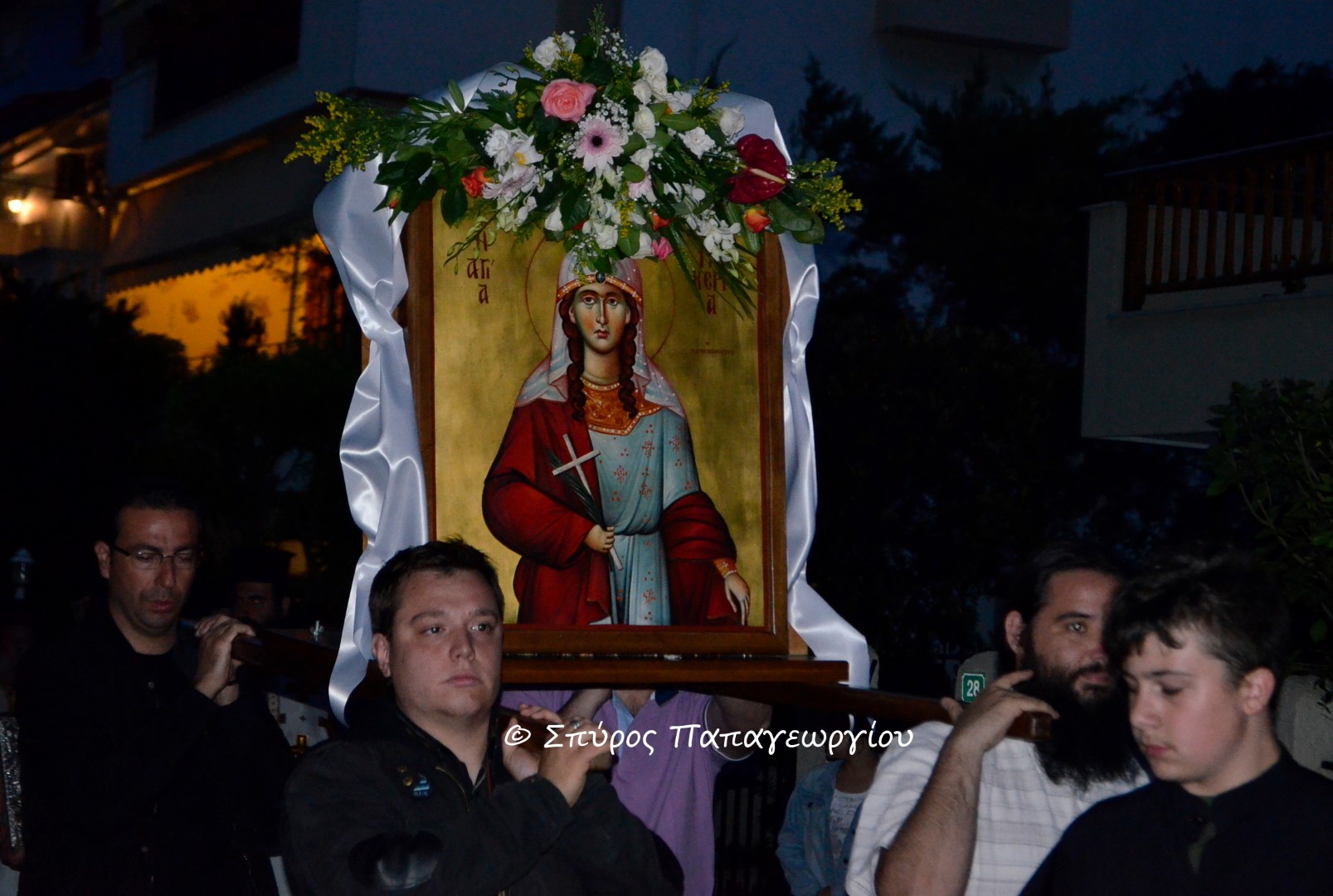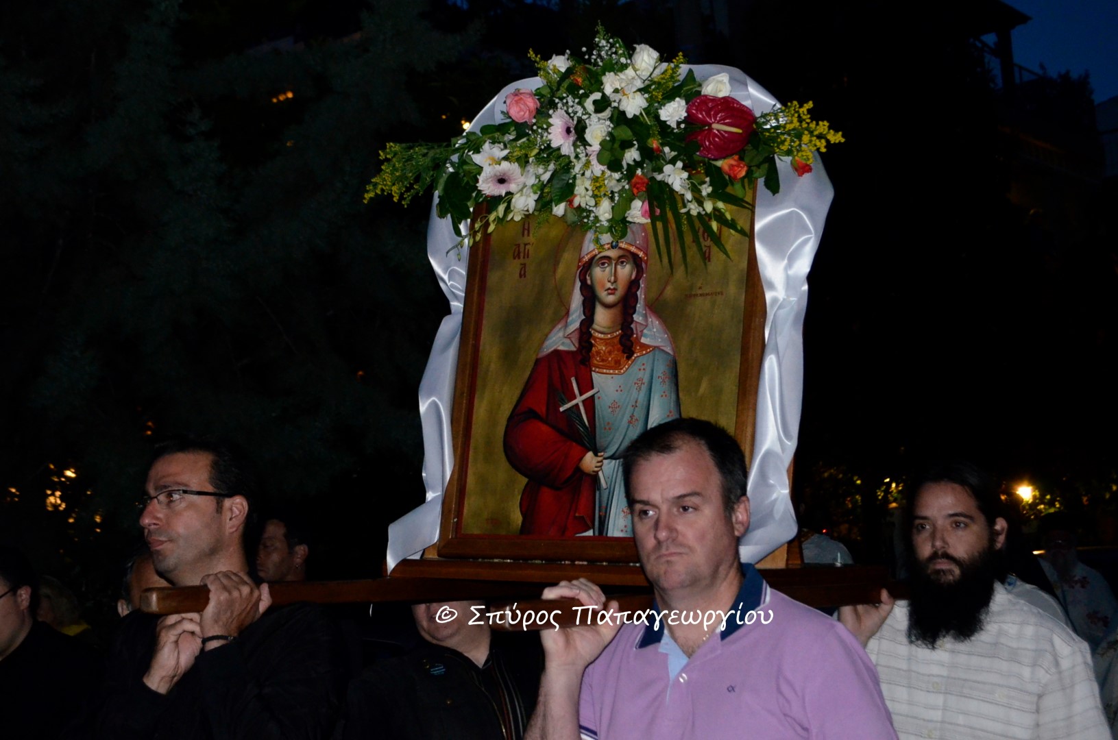 Εν συνεχεία τελέστηκε η λιτάνευση της Εικόνας και του τεμαχίου λειψάνου της Αγίας που φυλάσσεται στο Ναό, υπο τους ήχους της Φιλαρμονικής του Δήμου Πετρουπόλεως.