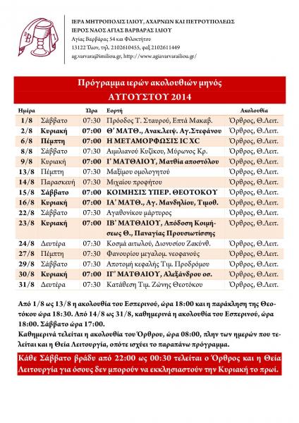 Δείτε το πρόγραμμα των ακολουθιών του Ι.Ν. Αγ. Βαρβάρας Ιλίου για τον μήνα Αύγουστο 2015.