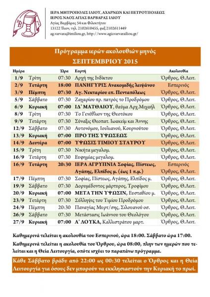 Δείτε το πρόγραμμα των ακολουθιών του Ι.Ν. Αγ. Βαρβάρας Ιλίου για τον μήνα Σεπτέμβριο 2015.