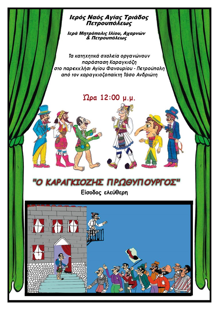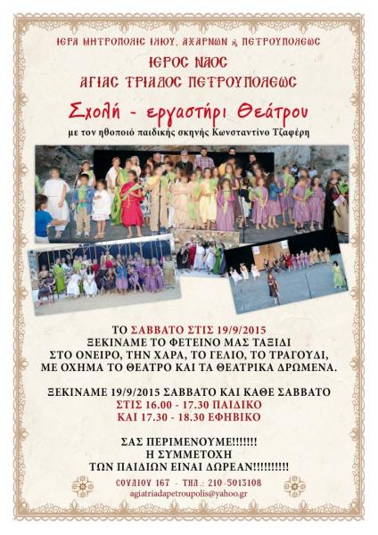 Δείτε το σύνολο των αφισών στο slideshow επάνω. Η έναρξη θα γίνει την Κυριακή 13 Σεπτεμβρίου 2015, στις 11:00. Μετά τον Αγιασμό θα ακολουθήσει παράσταση Καραγκιόζη από τον Καραγκιοζοπαίκτη Τάσο Ανδριώτη στην παράσταση «Ο Καραγκιόζης πρωθυπουργός».