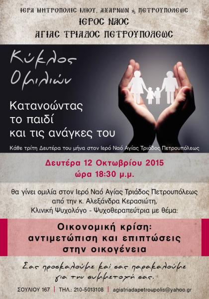 Ομιλία της κας. Αλεξάνδρας Κερασιώτη με θέμα τις επιπτώσεις στην οικογένεια από την οικονομική κρίση, στον Ι.Ν. Αγ. Τριάδας Πετρουπόλεως, τη Δευτέρα 12 Οκτωβρίου 2015, στις 18:30.