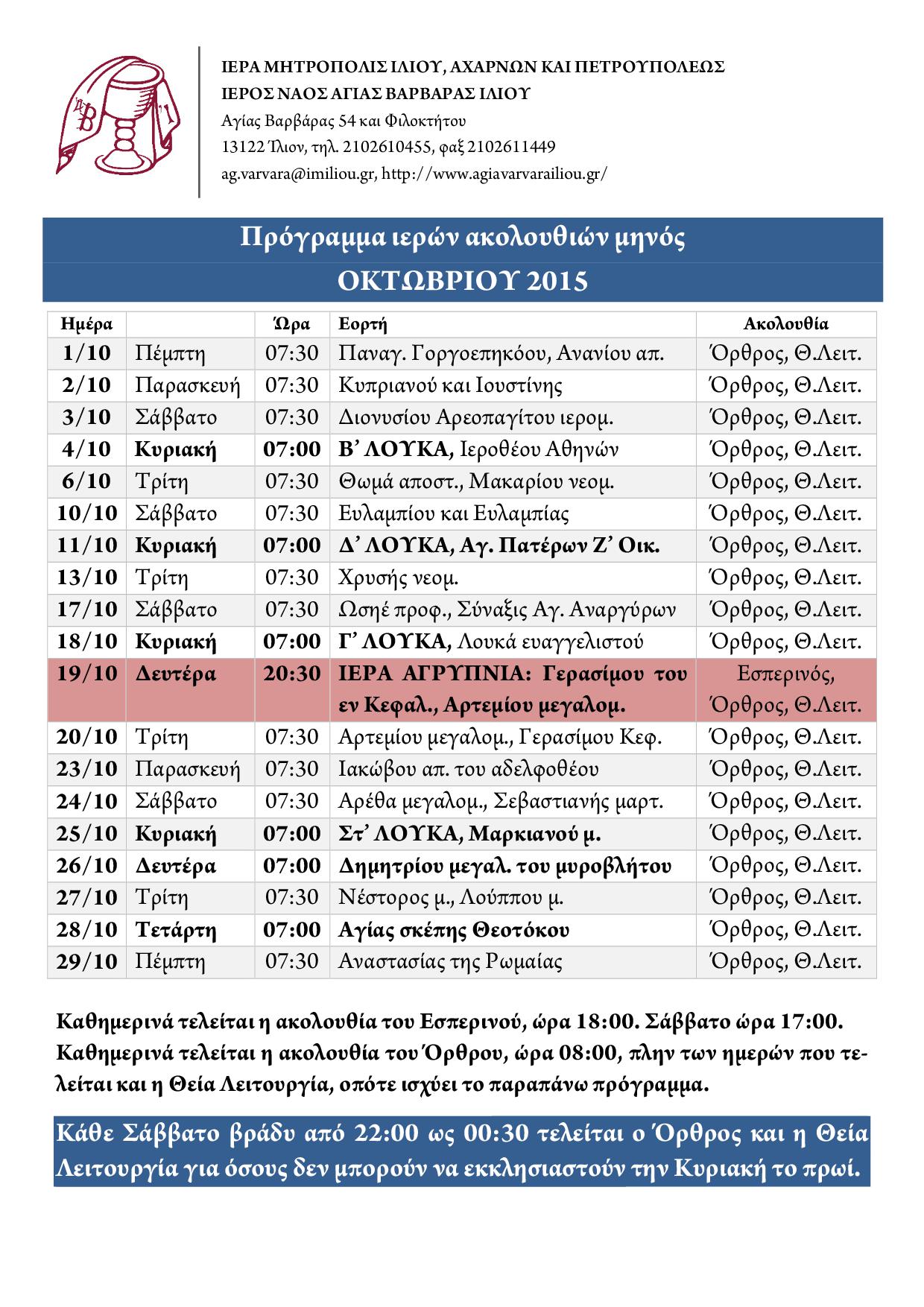 Δείτε το πρόγραμμα των ακολουθιών του Ι.Ν. Αγ. Βαρβάρας Ιλίου για τον μήνα Οκτώβριο 2015.