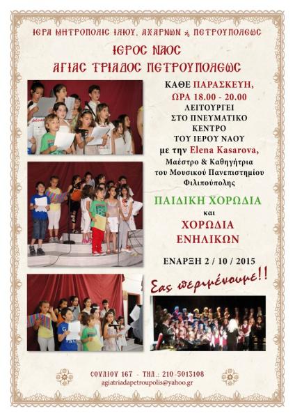 Η παιδική χορωδία και η χορωδία ενηλίκων του Ι.Ν. Αγ. Τριάδας Πετρουπόλεως ξεκίνησαν τις πρόβες από την Παρασκευή 2 Οκτωβρίου και κάθε Παρασκευή, 18:00-20:00.