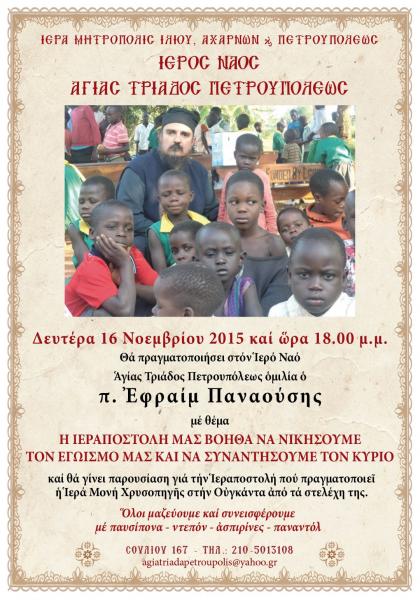 Με θέμα «Η ιεραποστολή μας βοηθά να νικήσουμε τον εγωισμό μας και να συναντήσουμε τον Κύριο» θα μιλήσει ο Αρχιμανδρίτης Εφραίμ Παναούσης στον Ι.Ν. Αγ. Τριάδας Πετρουπόλεως τη Δευτέρα 16 Νοεμβρίου 2015, στις 18:00.