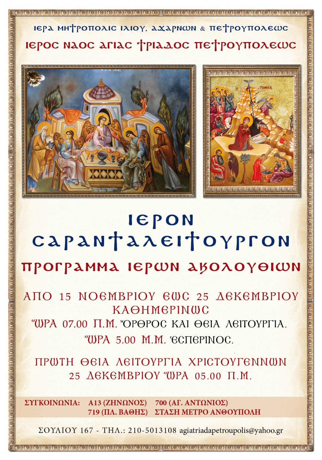 Στον Ι.Ν. Αγ. Τριάδας Πετρουπόλεως θα τελεστεί το Σαρανταλείτουργο των Χριστουγέννων, από 15/11 ως 24/12.