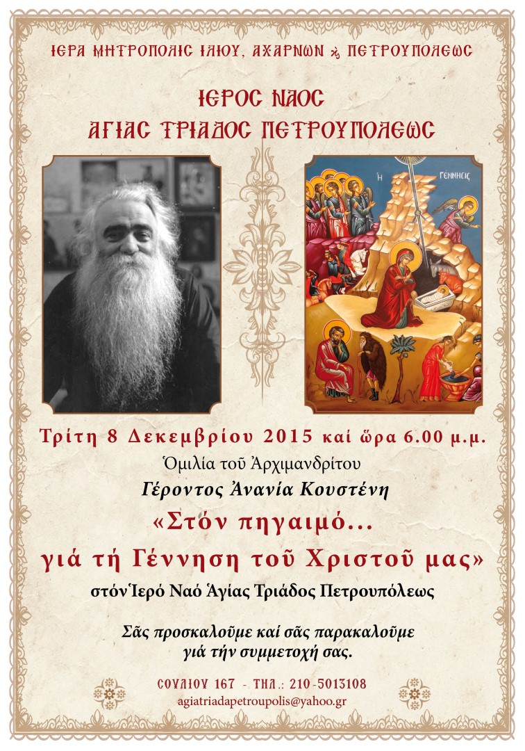 Με θέμα «Στον πηγαιμό για τη Γέννηση του Χριστού μας» θα μιλήσει ο Πανοσιολογιώτατος Αρχιμανδρίτης Ανανίας Κουστένης στον Ι.Ν. Αγ. Τριάδας Πετρουπολεως.