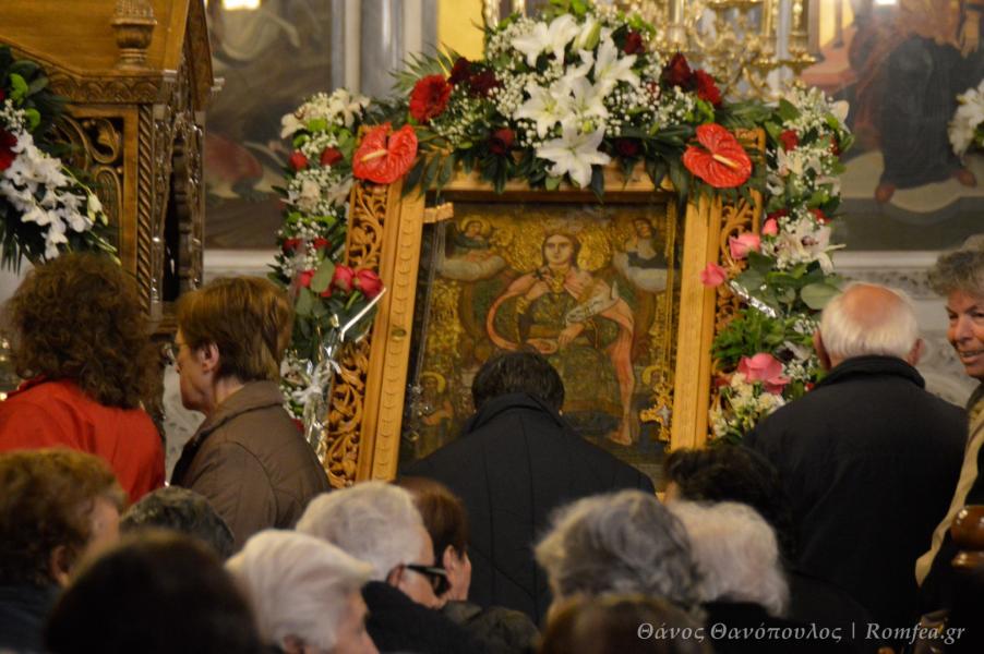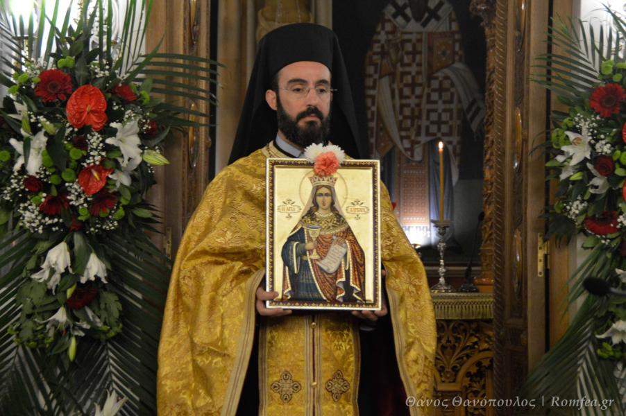 Ο κ. Αθηναγόρας με σύντομη ομιλία του επαίνεσε το μαρτύριο της Αγίας και συνέδεσε τη μαρτυρία της Αγίας με την ζωή προσφοράς του κληρικού, λίγο πριν τελέσει την χειροθεσία του π. Παναγιώτη Κολοκώτσιου, εφημερίου του Ιερού Ναού, σε Πρωτοπρεσβύτερο.