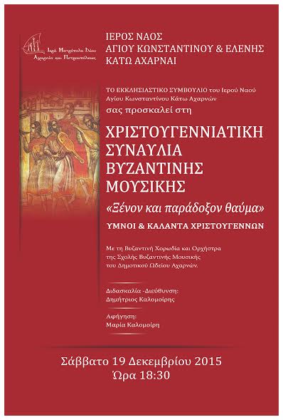 Χριστουγεννιάτικη συναυλία βυζαντινής μουσικής με τίτλο «Ξένον και παράδοξον θαύμα» θα δοθεί υπό τη διεύθυνση του Πρωτοψάλτη κ. Δημητρίου Καλομοίρη στον Ι.Ν. Αγ. Κωνσταντίνου και Ελένης Κάτω Αχαρνών, το Σάββατο 19 Δεκεμβρίου 2015, στις 18:30.