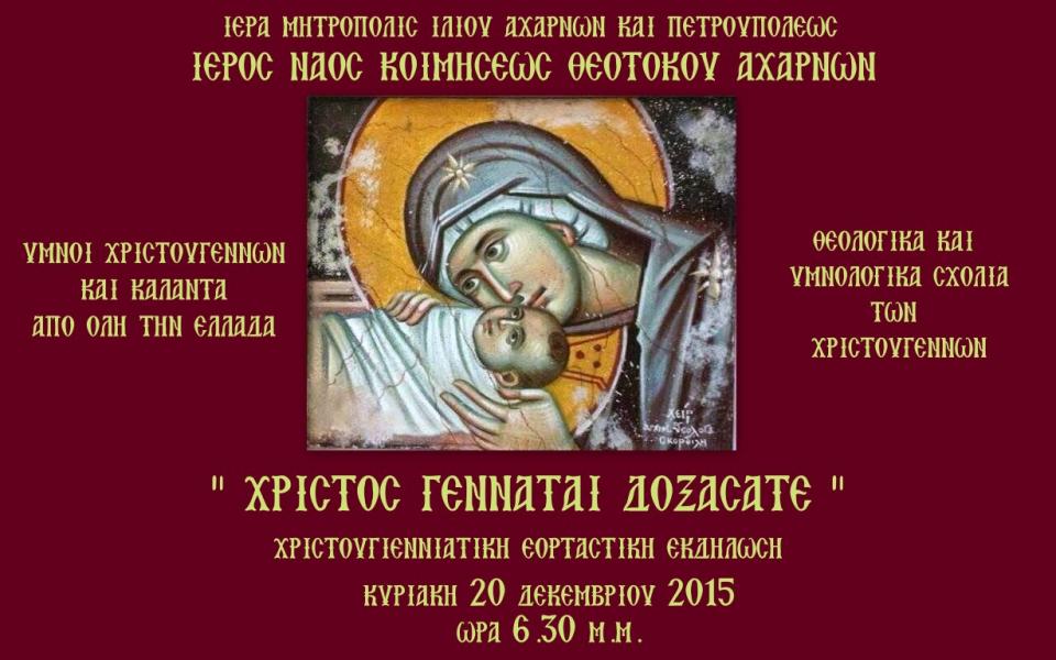 Χριστουγεννιάτικη εορταστική εκδήλωση με ύμνους και κάλαντα από όλη την Ελλάδα μαζί με θεολογικά και υμνολογικά σχόλια στον Ι.Ν. Κοιμήσεως Θεοτόκου Αχαρνών.