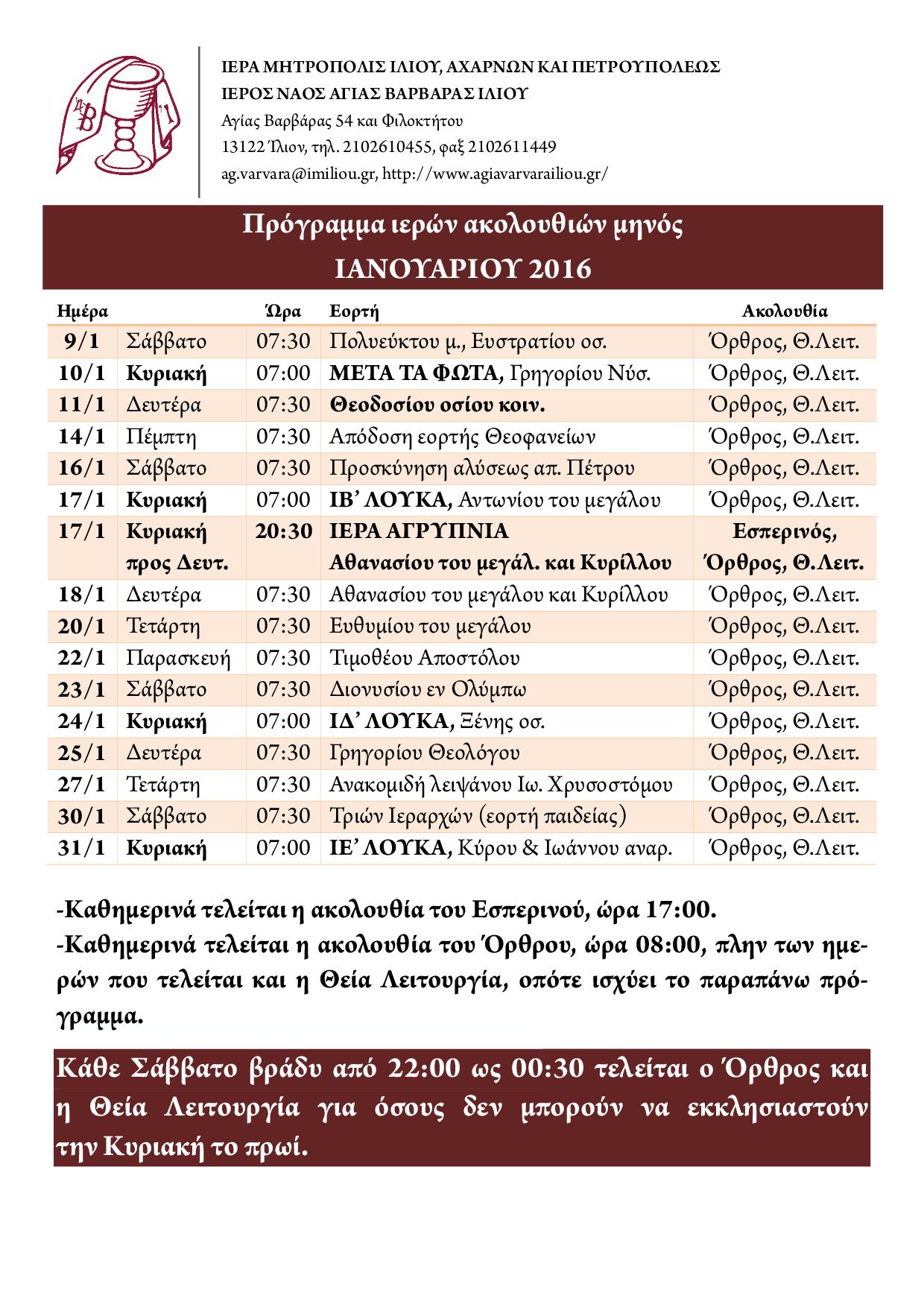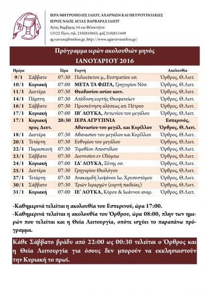 Δείτε το πρόγραμμα των ακολουθιών του Ι.Ν. Αγ. Βαρβάρας Ιλίου για το μήνα Ιανουάριο 2016.