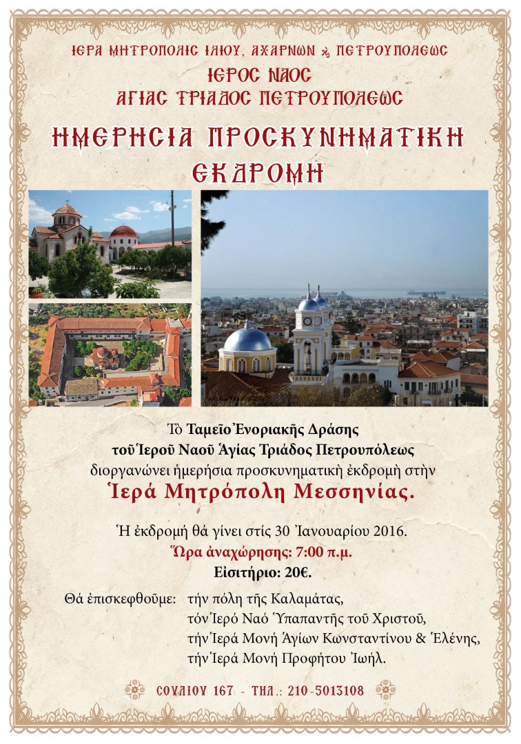 Το Ταμείο Ενοριακής Δράσης του Ι.Ν. Αγ. Τριάδας Πετρουπόλεως διοργανώνει ημερήσια εκδρομή στην Ι.Μ. Μεσσηνίας.