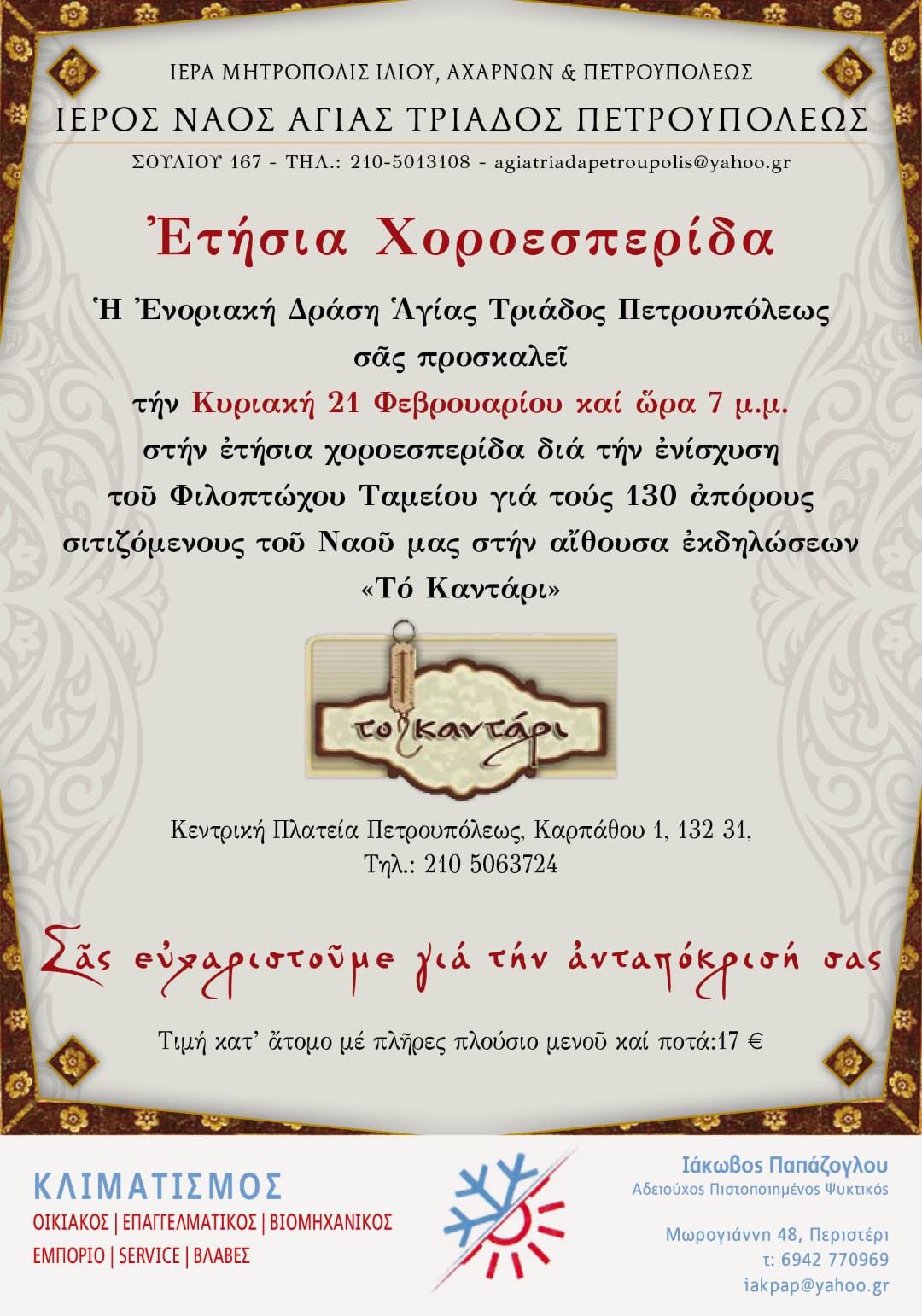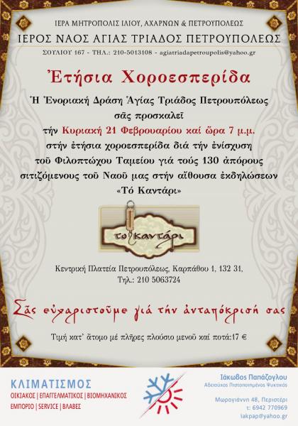 Την ετήσια χοροεσπερίδα ενίσχυσης του συσσιτίου του Ι.Ν. Αγ. Τριάδας Πετρουπόλεως διοργανώνει το Ταμείο Ενοριακής Δράσεως της ενορίας.
