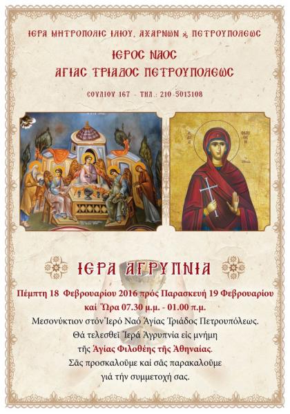 Αγρυπνία θα τελεστεί στον Ι.Ν. Αγ. Τριάδας Πετρουπόλεως για την εορτή της Αγίας Φιλοθέης της Αθηναίας.