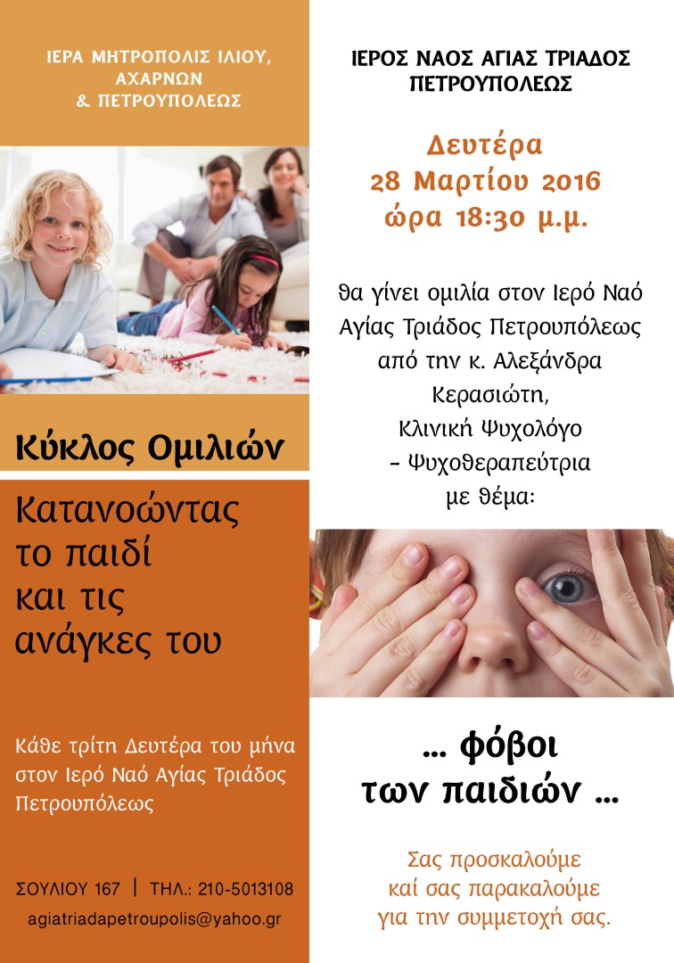 Η κλινική ψυχολόγος-ψυχοθεραπεύτρια κα. Αλεξάνδρα Κερασιώτη θα μιλήσει τη Δευτέρα 28 Μαρτίου 2016, στις 18:30, στον Ι.Ν. Αγ. Τριάδας Πετρουπόλεως με θέμα: