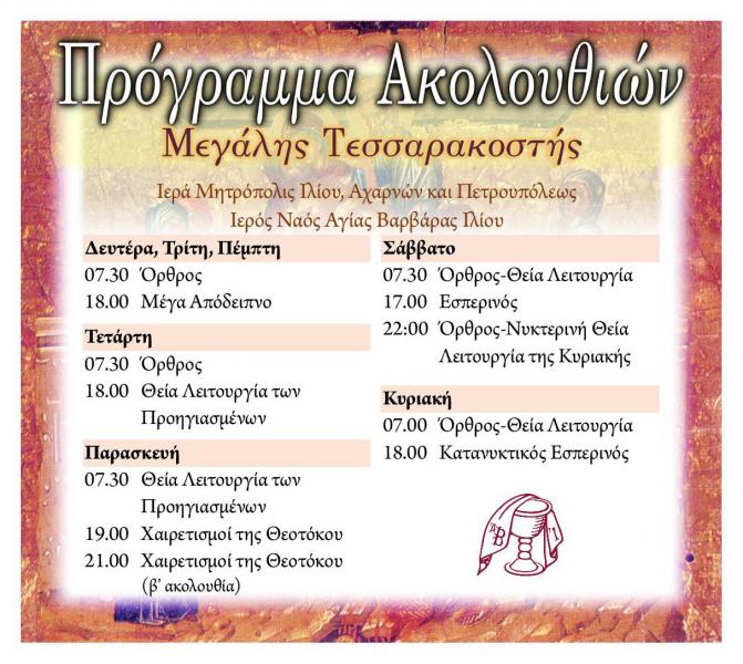 Δείτε το πρόγραμμα των ακολουθιών του Ι.Ν. Αγ. Βαρβάρας Ιλίου για τη Μεγάλη Τεσσαρακοστή του 2016.