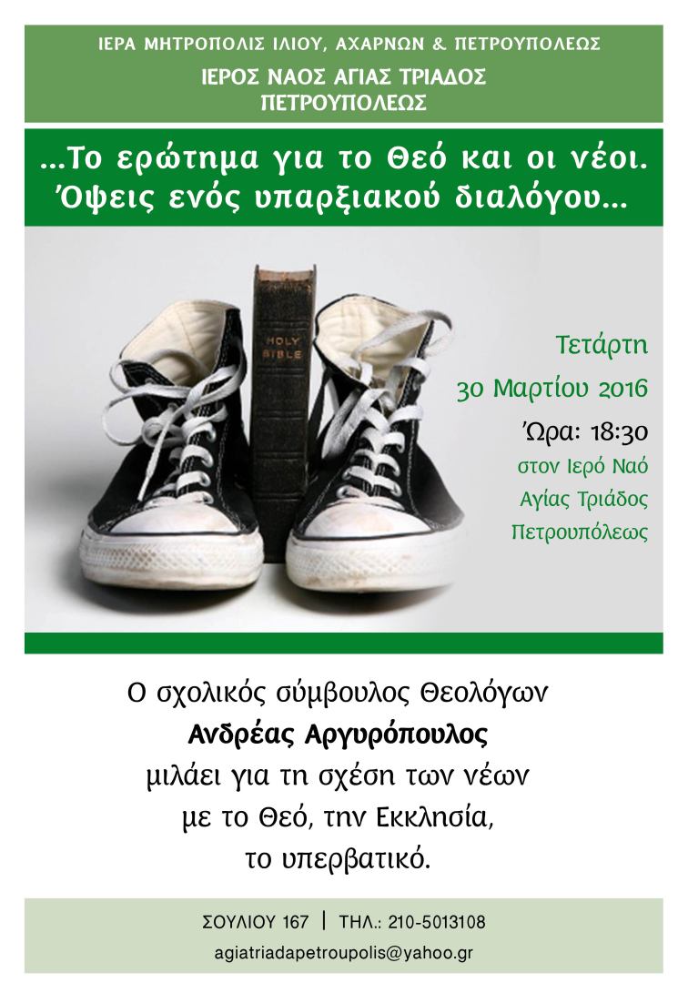«Το ερώτημα για τον Θεό και οι νέοι», ομιλία στην Αγ. Τριάδα Πετρ.