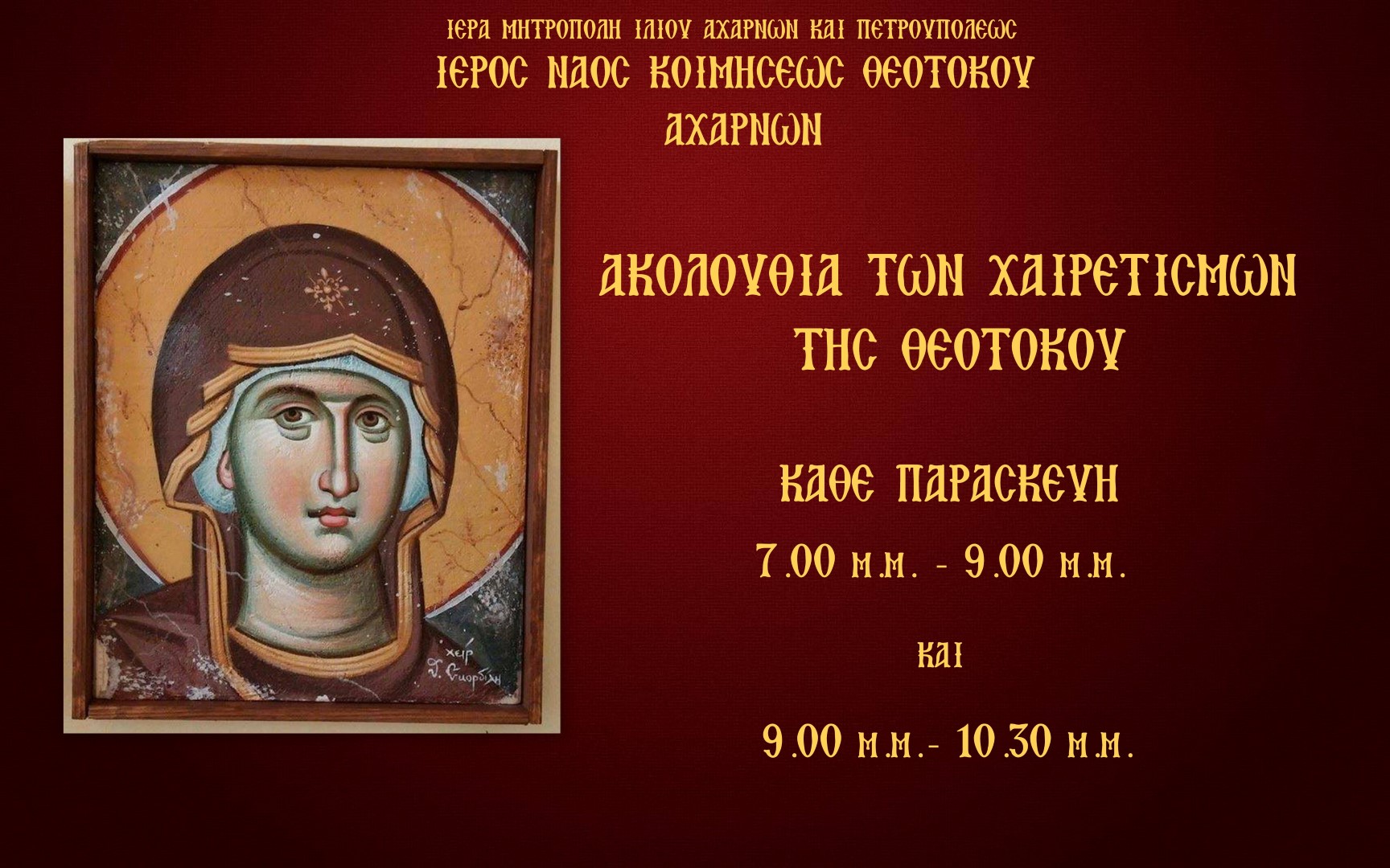 Δύο ακολουθίες χαιρετισμών κάθε Παρασκευή στον Ι.Ν. Κοιμήσεως Θεοτόκου Αχαρνών