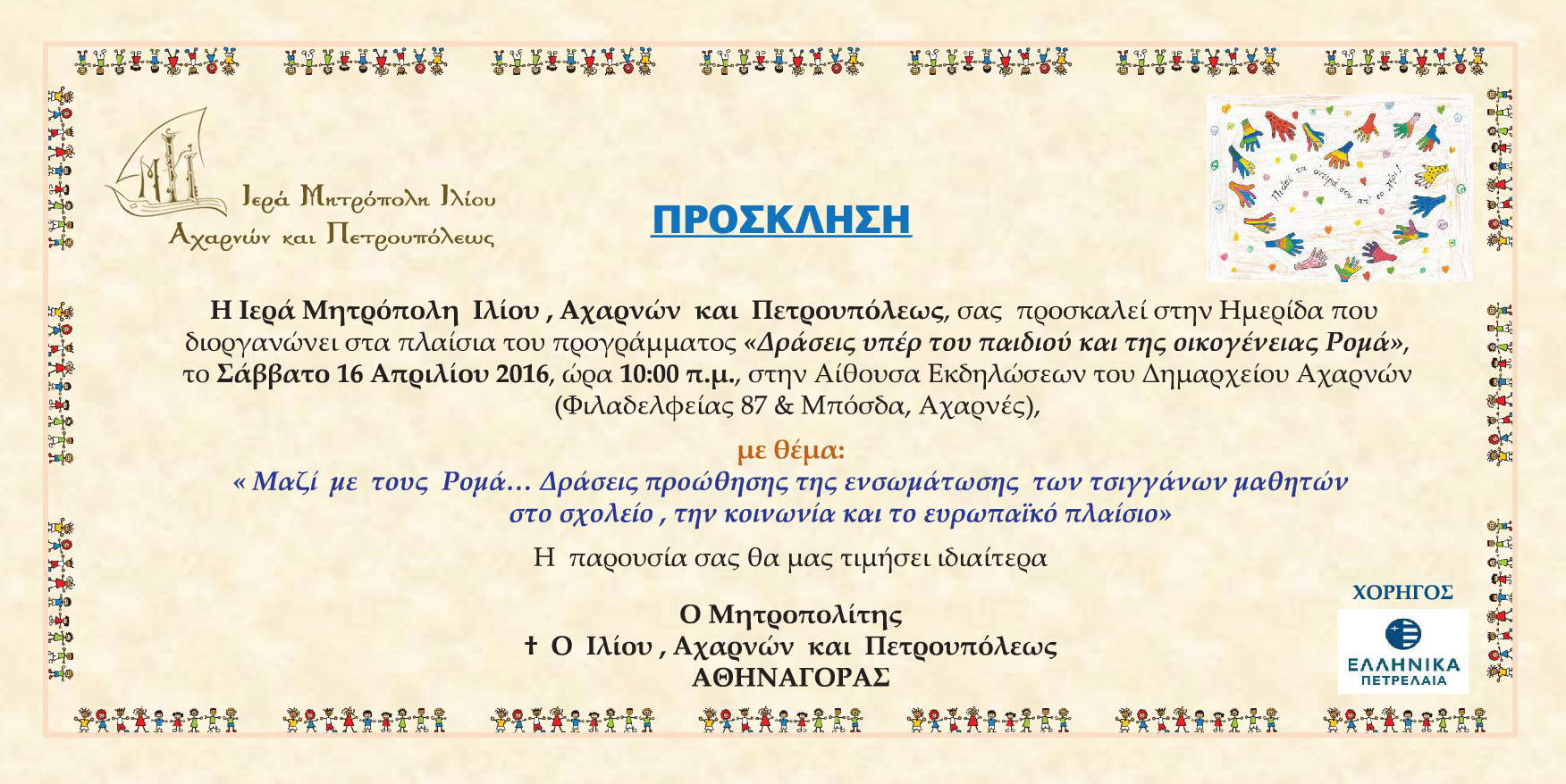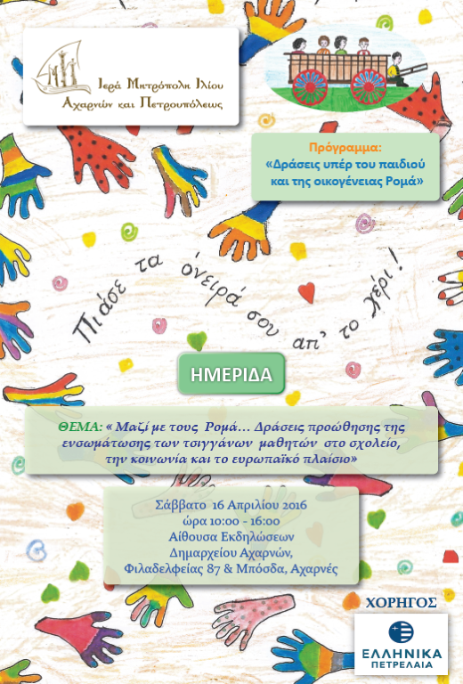 Η Ιερά Μητρόπολη Ιλίου, Αχαρνών και Πετρουπόλεως σας προσκαλεί στην ημερίδα που διοργανώνει στα πλαίσια του προγράμματος «Δράσεις υπέρ του παιδιού και της οικογένειας Ρομά».