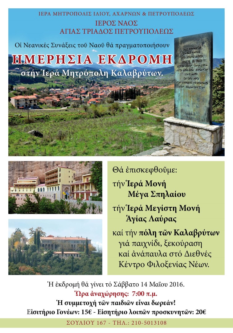 Στην Αγία Λαύρα, την Ιερά Μονή Μεγάλου Σπηλαίου και το Διεθνές Κέντρο Φιλοξενίας Νέων θα εκδράμουν οι ενορίτες της Αγ. Τριάδας Πετρουπόλεως, το Σάββατο 14 Μαΐου 2016.