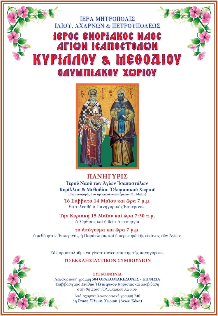 Πανηγυρίζει η ενορία των Αγίων Κυρίλλου και Μεθοδίου στο Ολυμπιακό χωριό. Η μνήμη τους μετατίθεται από την Τετάρτη 11/5 στην Κυριακή 15/5.