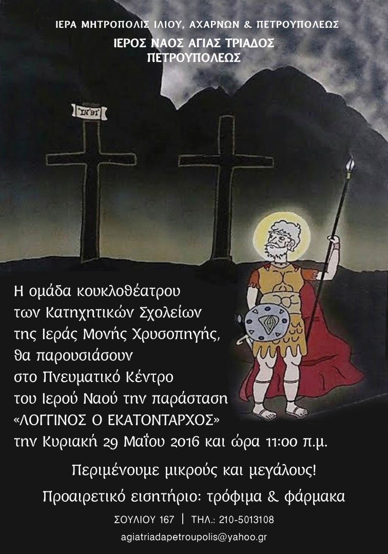 Η ομάδα κουκλοθέατρου των Κατηχητικών Σχολείων της Ι. Μονής Χρυσοπηγής θα παρουσιάσουν στο Πνευματικό Κέντρο του Ι. Ν. Αγ. Τριάδας Πετρουπόλεως την παράσταση «Λογγίνος ο εκατόνταρχος».