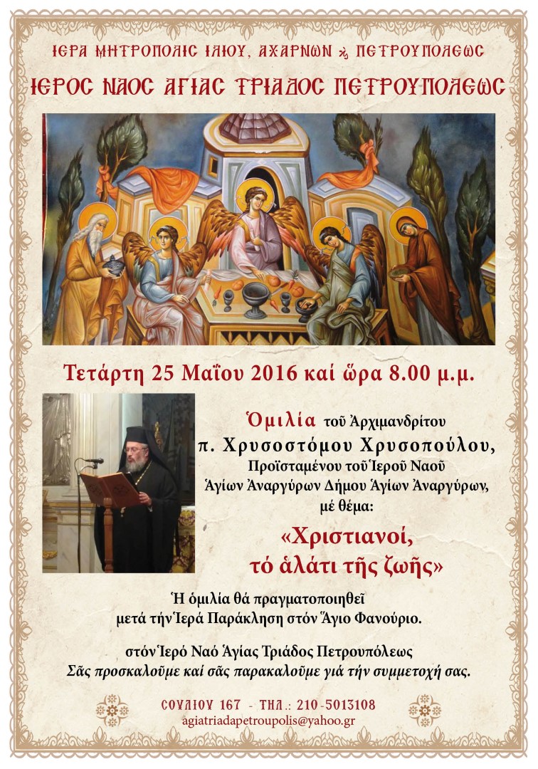 Η ομιλία θα γίνει στον Ι.Ν. Αγ. Τριάδας Πετρουπόλεως την Τετάρτη 25 Μαΐου 2016, στις 8 το βράδυ. Πριν την πραγματοποίηση της ομιλίας, θα τελεστεί Ιερά Παράκληση στον Άγιο Μεγαλομάρτυρα Φανούριο.