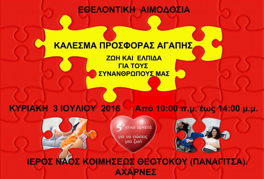 Την Κυριακή 3 Ιουλίου 2016, από 10 το πρωί ως 2 το μεσημέρι, θα γίνει εθελοντική αιμοδοσία στο προαύλιο του Ι.Ν. Κοιμήσεως Θεοτόκου Αχαρνών.